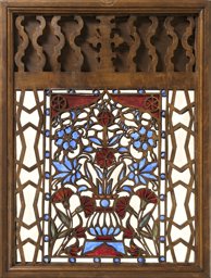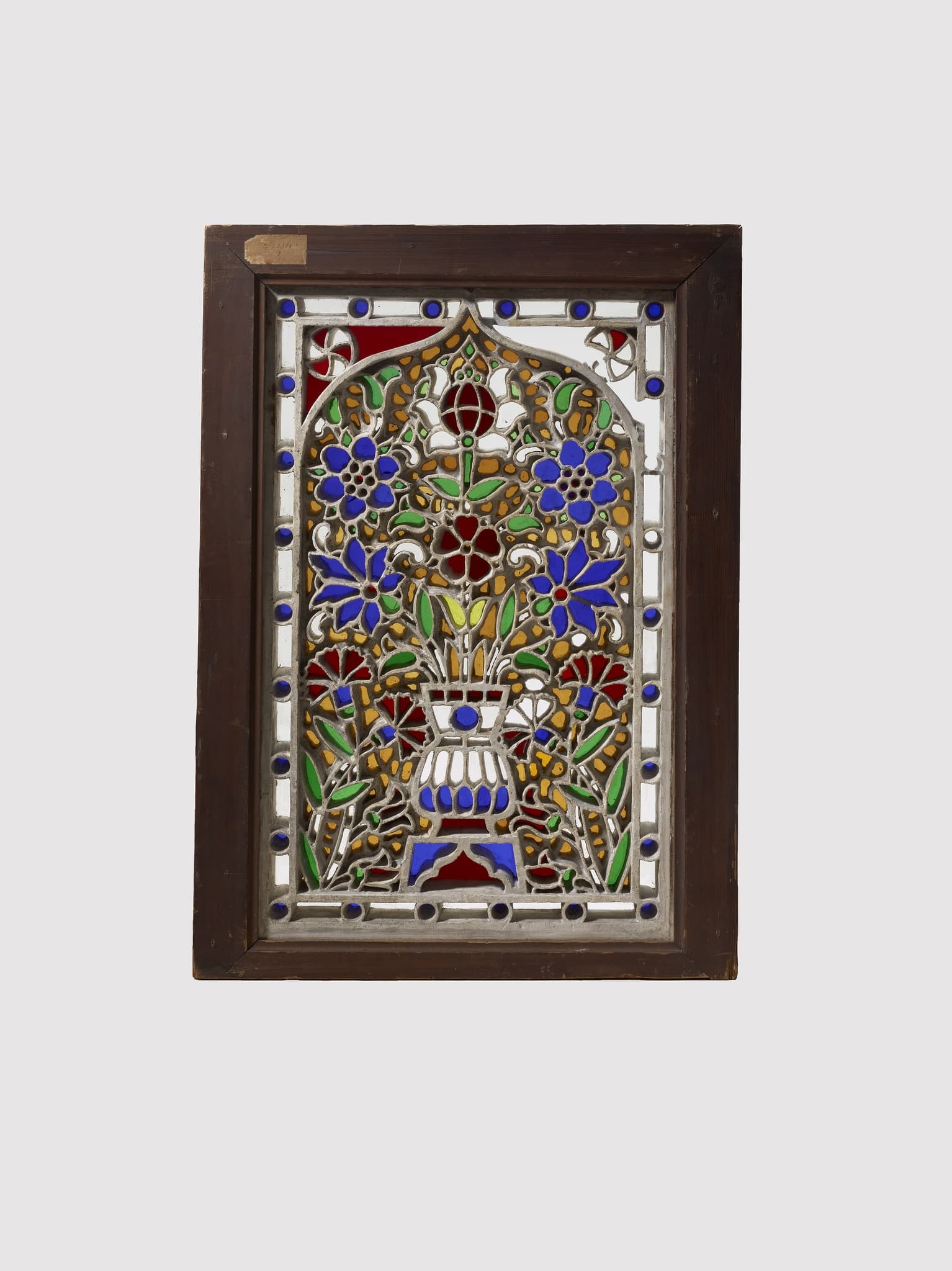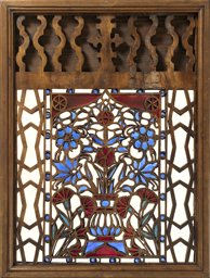 This stucco and glass window corresponds iconographically to one of the standard types of qamarīyyāt widespread in Egypt during the Ottoman period. Windows with the flowers and vase motif have survived in several of the collections studied (see for instance IG_7, IG_166, IG_178, IG_255, IG_356). The motif recurs in Islamic arts and appears in numerous media, such as ceramics, wood panelling, wall paintings, textiles, and stucco and glass windows, and over a long period of time, in both sacred and profane contexts. The motif aroused the interest of Western artists and architects in the 19th century, as is attested by a significant number of book illustrations, sketches, and paintings (see for instance IG_43, IG_118, IG_149, IG_153, IG_437, IG_443, IG_461), as well as by the replicas of such windows installed in Arab-style interiors across Europe (IG_54–IG_59, IG_64, IG_431, IG_484–IG_487).