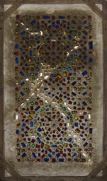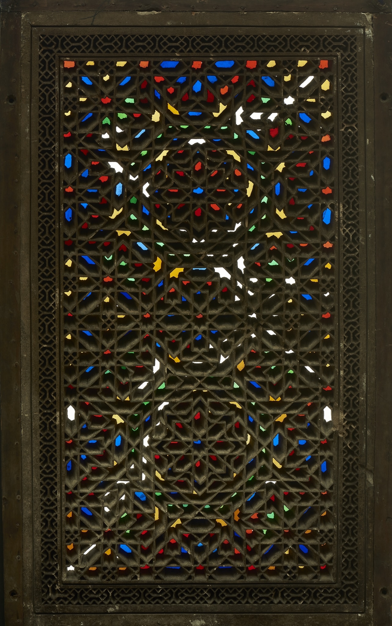 This stucco and glass window corresponds iconographically to one of the standard types of shamsiyyāt widespread in the Maghreb during the Ottoman period. Interlaced star ornaments are a recurring element in Islamic arts across time and media (see for instance Broug, 2013; Azzam, 2021, pp. 68–127). However, there are several formal characteristics, especially the purely geometric design and the complex interlace pattern, that allow us to narrow down the origin of the window to Tunisia. This geographical classification is supported by the description and illustration of a similarly designed window by the French architect Henri Saladin (1851–1923), who in his 1908 publication Tunis et Kairouan reports on a visit to a workshop in Tunis (Saladin, 1908, p. 75), where he commissioned several stucco and glass windows for the Tunisian pavilion at the 1889 Exposition Universelle in Paris (IG_248, see also IG_92).