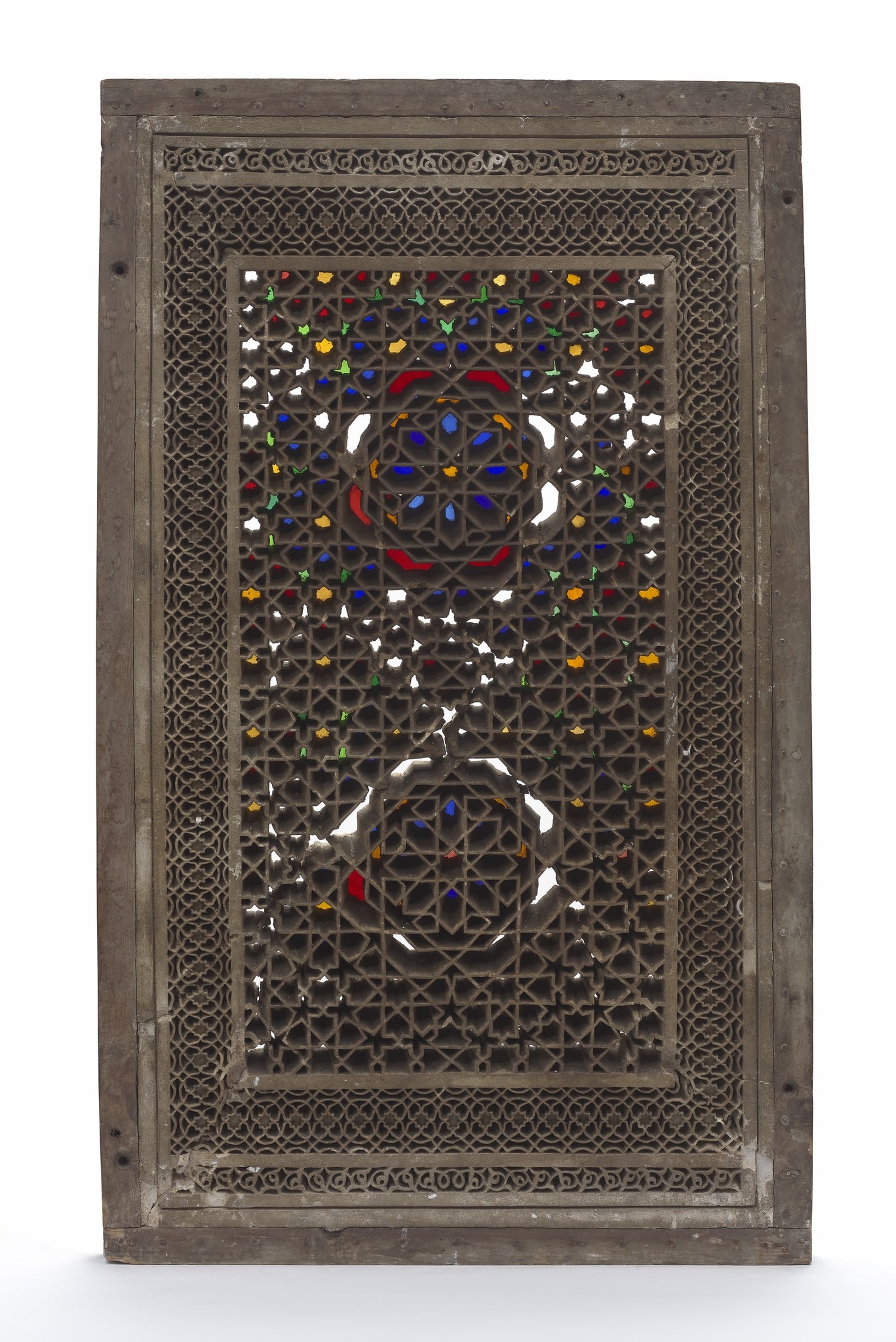 Latticework carved into a rectangular stucco panel and inlaid with colourless and coloured pieces of glass.