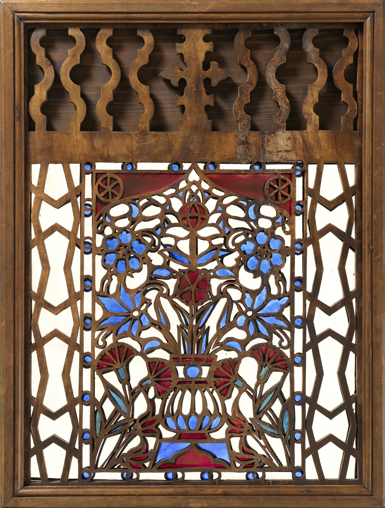 The window discussed here shows a traditional composition arranged along a central axis. However, the naturalistic, but unspecific representation of the flowers distinguish this work from Islamic stucco and glass windows of the same motif. The most significant difference however, when comparison is made with examples from Egypt, is the use of wood instead of stucco. A similar ‘material transfer’ from stucco to wood can be observed in the windows for the Arab Room of Cardiff Castle in Wales designed by the British architect William Burges (1827–1881) (IG_484–IG_487). Like these windows, the replica here, as well as four similar replicas in the Wien Museum collection (IG_372–IG_375), was probably made in a local (Austrian) workshop.