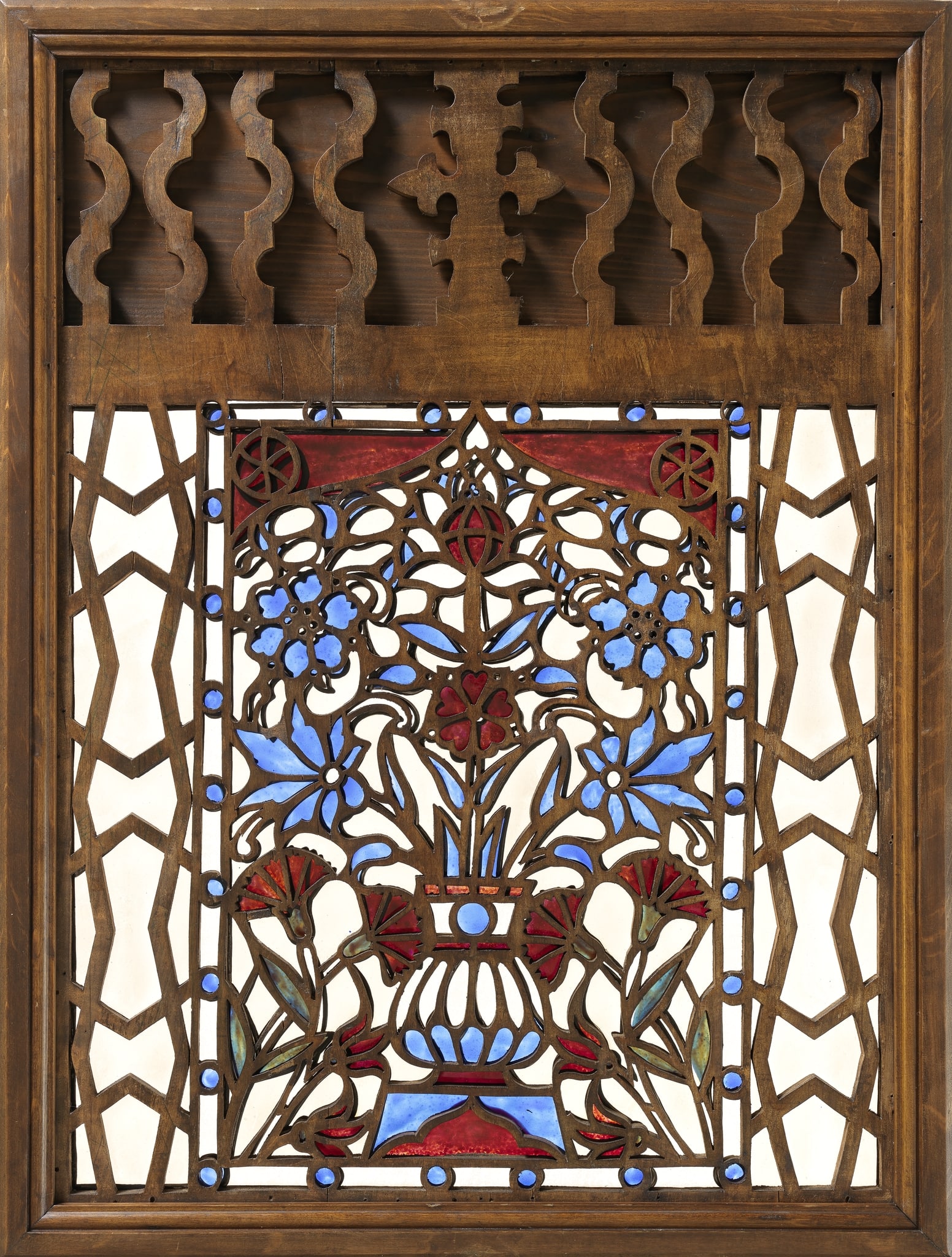 This wooden replica of a rectangular stucco and glass window with a motif of flowers in a vase is incorporated in a wooden mashrabiyya. The flowers are arranged symmetrically along the central axis. The representation of the flowers is more naturalistic than in Islamic stucco windows with the same motif. Despite the naturalistic rendering of the flowers, it is not possible to determine the species. The vase sits on a low base (a small table or stool) and is flanked by tulips and carnations. The flowers-in-a-vase motif is framed by an ogee arch. Stylizised six-petalled flowers adorn the spandrels above the arch. A rectangular double frame decorated with blue dots surrounds the entire motif.