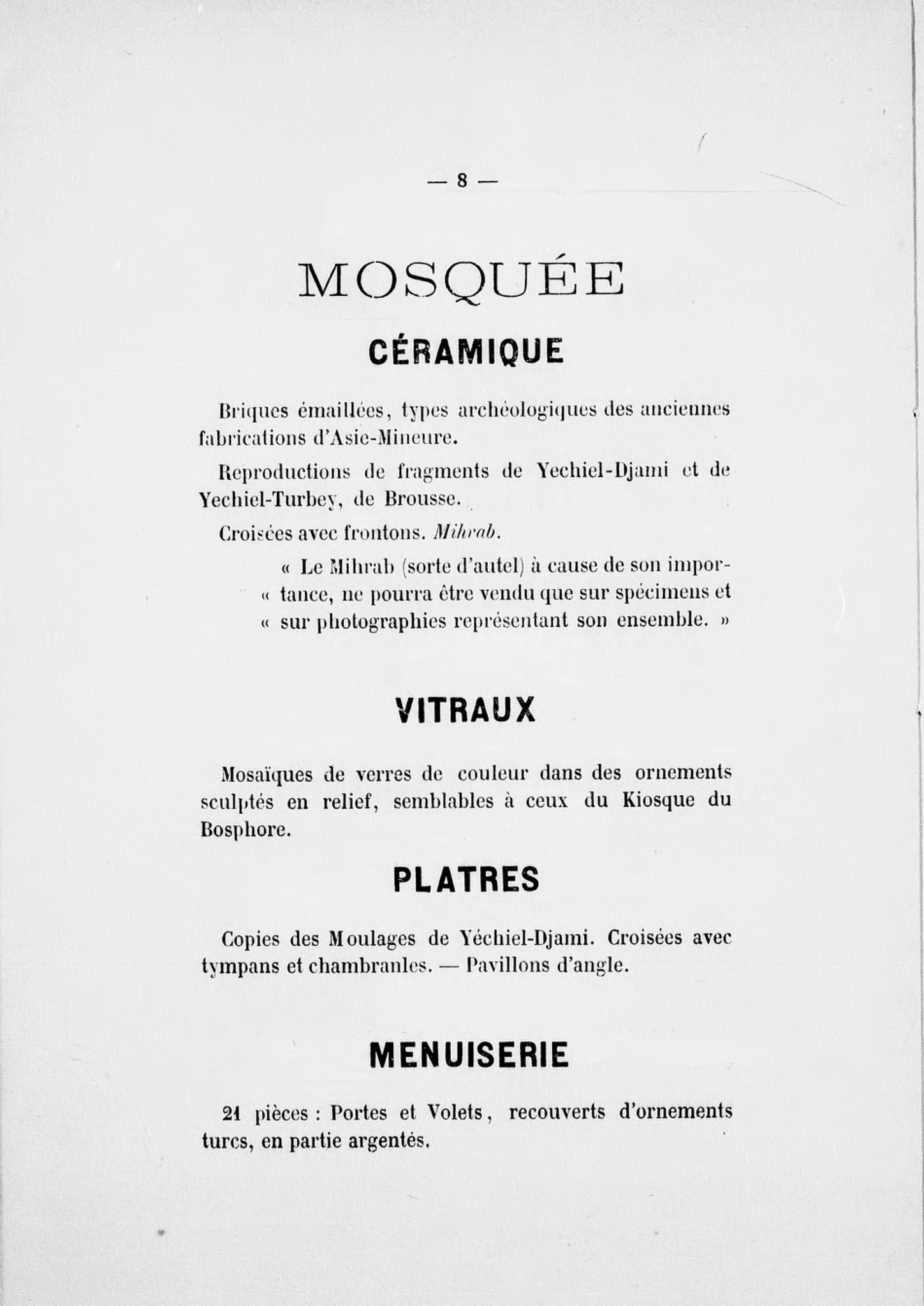 According to the auction catalogue, after the end of the 1867 Exposition Universelle in Paris, windows from the Ottoman Mosque pavilion (‘Vitraux’) were publicly exhibited on 1 December 1867, and were auctioned off on 2, 3, 6, and 7 December.