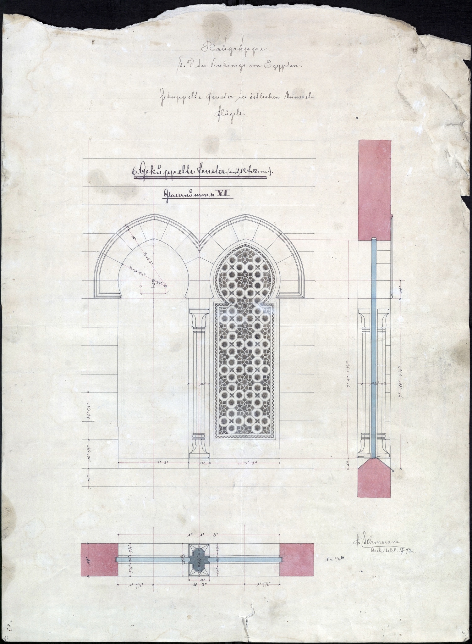 The window’s stucco lattice is an exact copy of a window drawn by Schmoranz in 1871 in Cairo in the mausoleum of the Qalawun funerary complex (built in 1284–1285) (IG_411). The only adjustment Schmoranz made was to the outline, giving the windows for Vienna a pointed arch. Photographs of the Egyptian pavilion at the Vienna world’s fair document that three mullioned windows of this design were used on both the front and the back of the minaret annex (see for example IG_458).