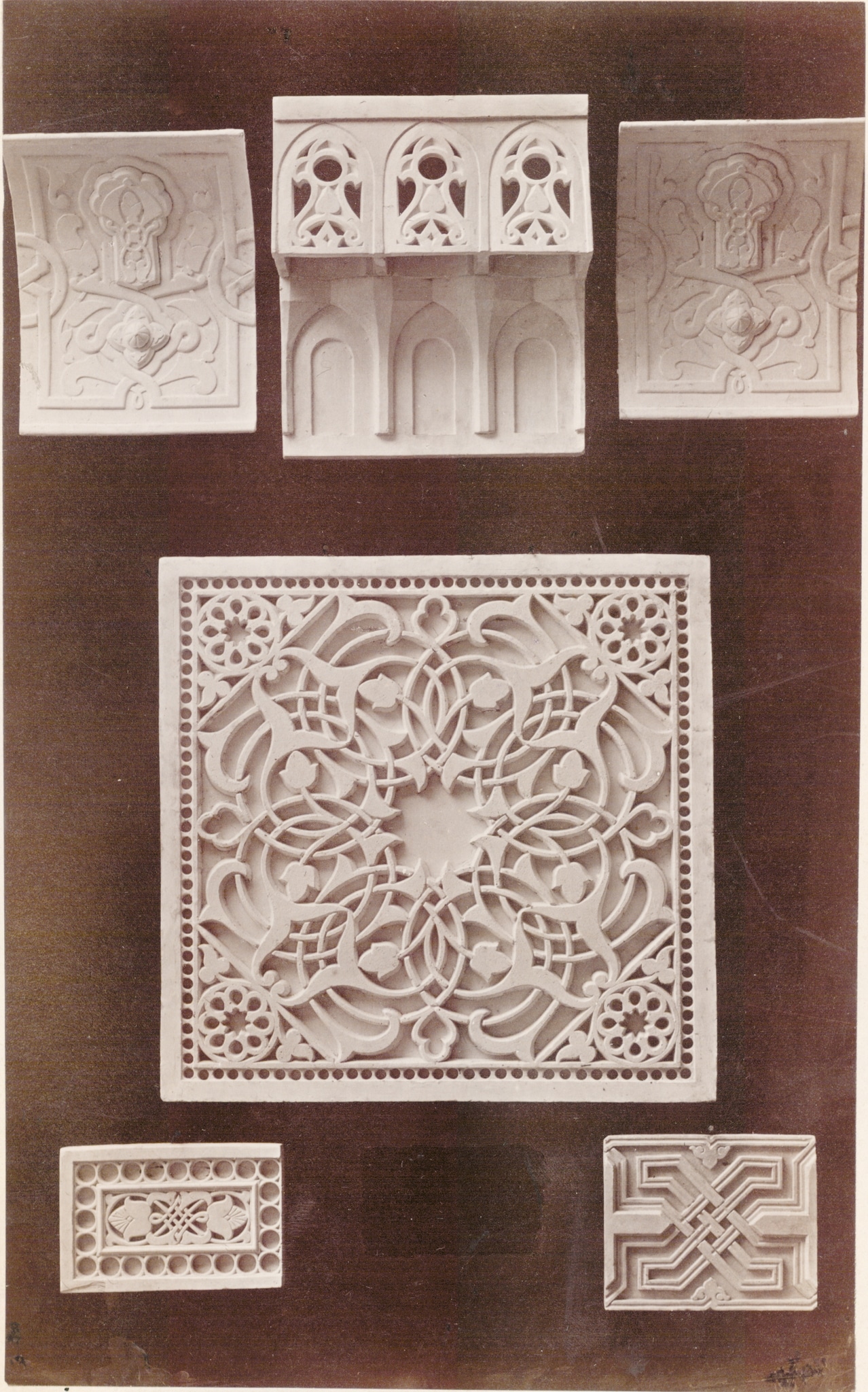 The centrally positioned square model can be linked to the stucco and glass windows at the top of the mashrabiyya oriels on the front façade of the central avant-corps of the 1873 Egyptian pavilion, which is documented photographically (IG_457). In a newspaper article, the author Carl von Vincenti describes the triple windows above the mashrabiyyāt in the harem of the Arab dwelling as patterns of glass inlaid in ‘gypsum arabesques’. According to Vincenti, this type of window was called a ‘karamin’, and the high chambers of the Egyptian pavilion owed their pleasant twilight to them. (‘Man nennt diese Oberfenster „Karamin“ und ihren farbigen, in Gipsarabesken eingefügten Glasmustern verdanken die hohen Gemächer ein ganz eigenthümlich wohltuendes Dämmerlicht.’; Vincenti, 1873, p. 1995).