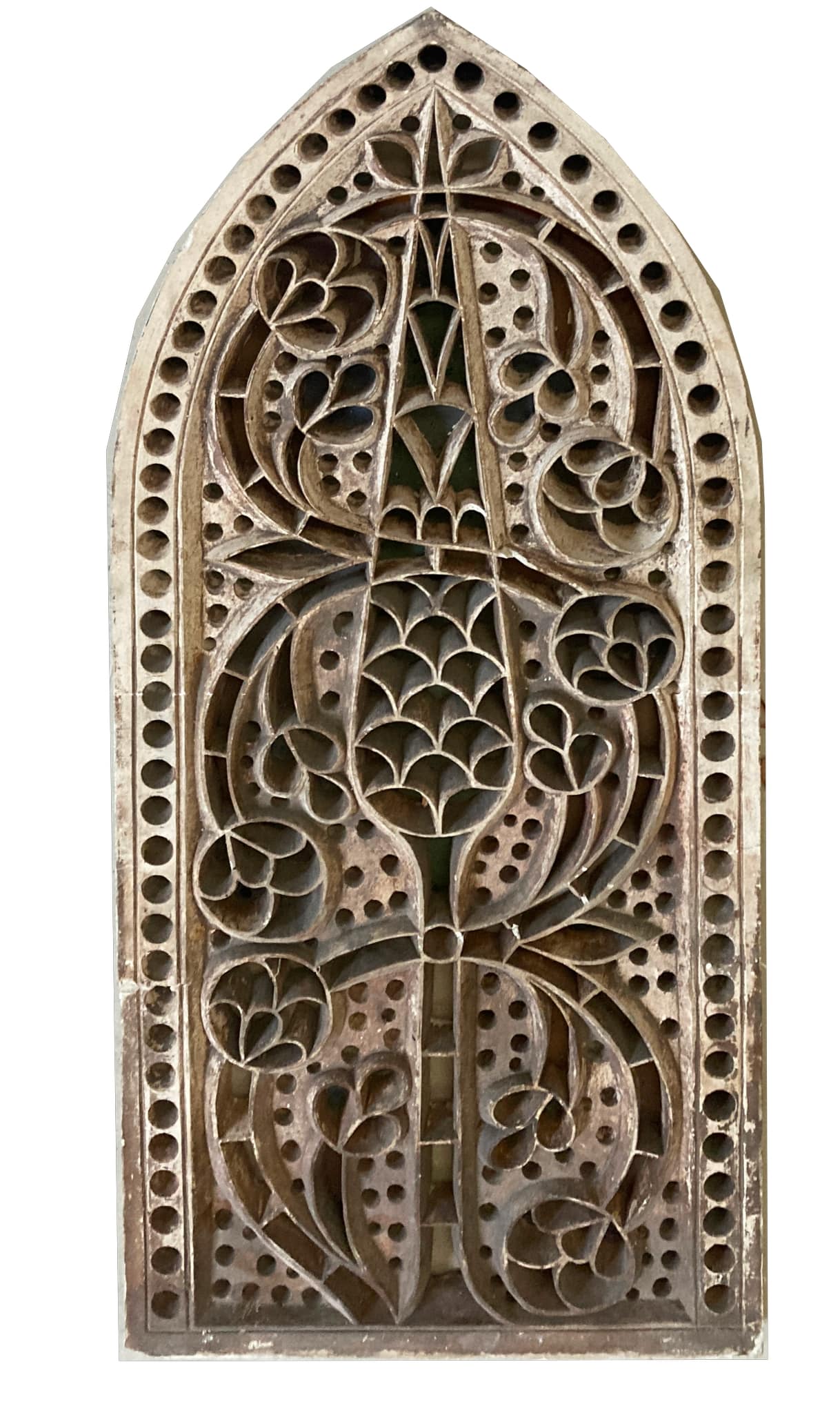 Owing to the formal, compositional, and technical characteristics of the window, Thierry Liot’s assumption that it too may have belonged to the late 18th-century Damascene house from which the ceiling, mihrab, and woodwork of Loti’s ‘mosque’ at Rochefort are thought to have originated (Liot, 1999, p. 130; see also Giraud-Heraud, 1996, pp. 64–65) has to be rejected. In fact, it is much more likely that this window, together with IG_427, IG_429, and IG_430, is a replica made in France on the basis of IG_426. The pointed-arch form of the stucco panel and the unusual outline of the flower tendrils point to a Western designer, perhaps Loti himself, and the extremely flat surface of the stucco grill is very different from that of windows manufactured in Egypt, including IG_426. While the stucco latticework of traditional Islamic windows such as IG 426 is carved, it seems that the grille of this window was cast; moreover, the pieces of glass used in this window differ from those of IG_426, on account of their regular shape (especially in the border area). These observations support the assumption that the replica was made in France and not in Egypt.