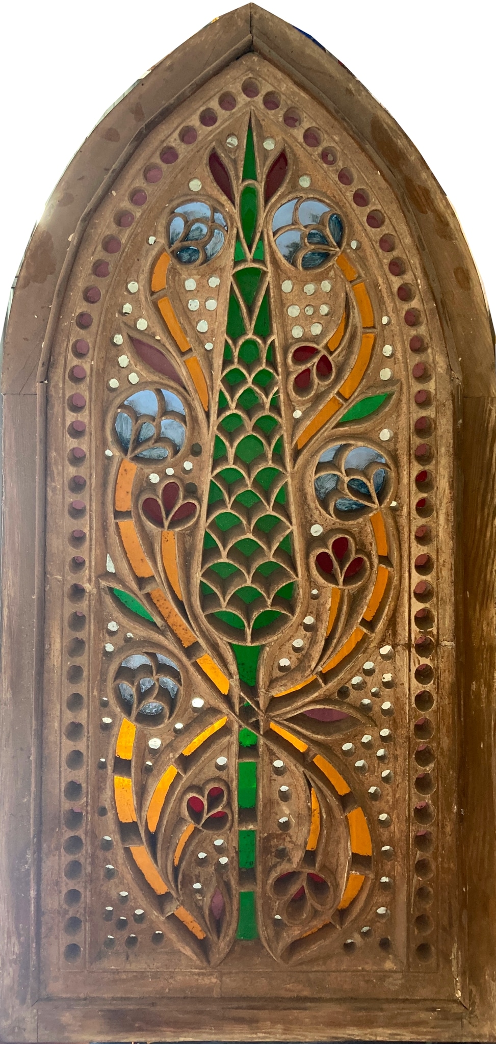 Owing to the formal, compositional, and technical characteristics of the window, Thierry Liot’s assumption that it may also have belonged to the late 18th-century Damascene house from which the ceiling, mihrab, and woodwork of Loti’s ‘mosque’ at Rochefort are thought to have originated (Liot, 1999, p. 130; see also Giraud-Heraud, 1996, pp. 64–65) has to be rejected. In fact, it is much more likely that this window, together with IG_427, IG_428, and IG_430, is a replica made in France on the basis of IG_426. The pointed-arch form of the stucco panel and the unusual outline of the flower tendrils point to a Western designer, perhaps Loti himself, and the extremely flat surface of the stucco grill is very different from windows manufactured in Egypt, including IG_426. While the stucco latticework of traditional Islamic windows such as IG 426 is carved, it seems that the grille of this window was cast; moreover, the pieces of glass used in this window differ from those of IG_426 on account of their regular shape (especially in the border area) and large size (they back several openings of the stucco lattice at once). These observations support the assumption that the replica was made in France and not in Egypt. Very atypical for Islamic stucco and glass windows also are the round pieces of glass backing entire rose blossoms, which in all the other windows examined within the project are backed by several smaller pieces. It is unclear whether the round pieces of glass here are original, or whether they are replacements made in the course of an undocumented restoration.