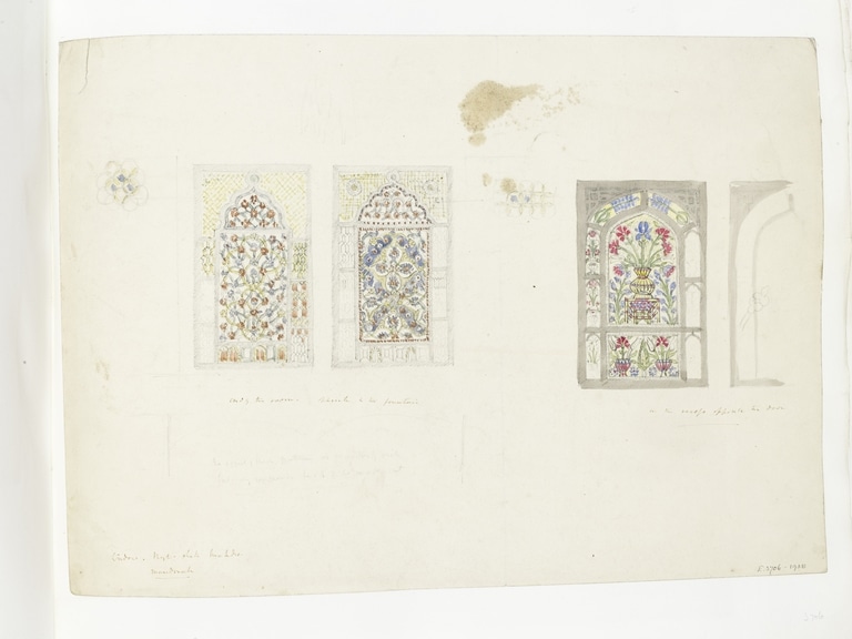 This pencil and watercolour drawing by the British architect James William Wild (1814–1892) shows three stucco and glass windows and the cropped outline of a window on the right side of the drawing.