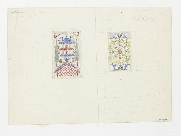 This pencil and watercolour drawing by the British architect James William Wild (1814–1892) depicts two rectangular stucco and glass windows. The window on the left side shows stylized architecture flanked by two cypress trees, and the window on the right features tendril ornament. Wild has indicated the outlines of further windows in fine pencil drawing on this sheet and added notes in fine pencil. The letters ‘a’ and ‘b’ can be read above the coloured window on the right-hand side.