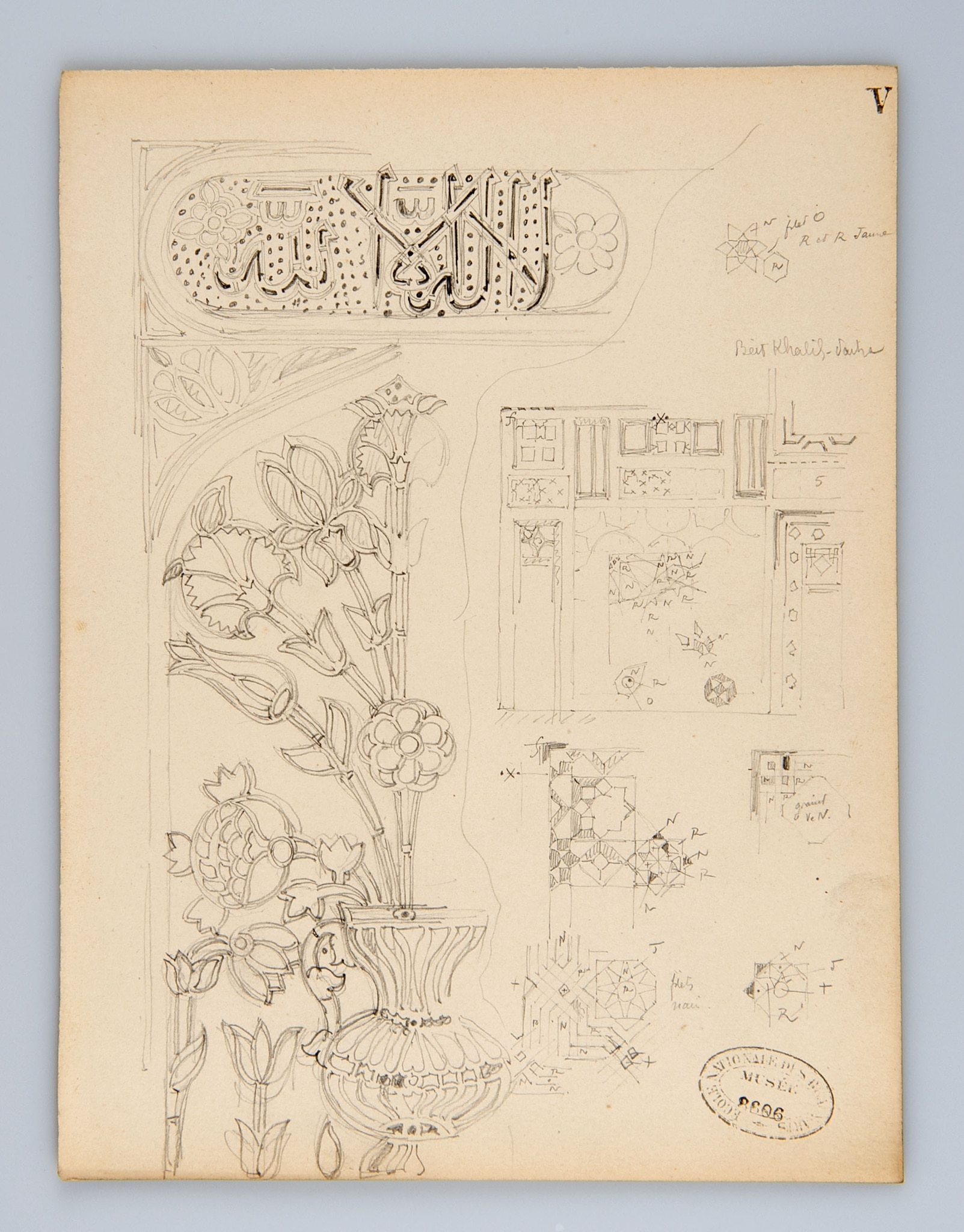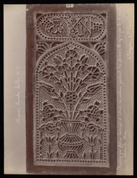The left part of this fine and detailed pencil drawing by the French architect Jules Bourgoin (1838–1908) shows part of a stucco and glass window with the motif of a vase of flowers. The vase, within a pointed arch, holds four different kinds of stylized flowers (carnations, lilies, roses) and is flanked by tulips on both sides. The cartouche above the arch has an Islamic inscription, its calligraphy in naskh script, with the first statement of the shahādah. Bourgoin concentrated on the left half of this symmetrical window, executing in their entirety the vase, the central flower, and the inscription. In the cartouche, Bourgoin indicated the perforations in the stucco panel with many small dots.