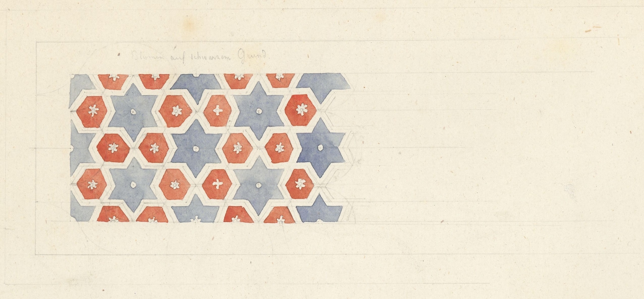This pencil and watercolour drawing made by the Bernese architect and draughtsman Theodor Zeerleder (1820–1868) depicts part of a stucco and glass window with the motif of six-pointed stars in blue surrounded by hexagons in red. Zeerleder added a pencil annotation to the drawing.