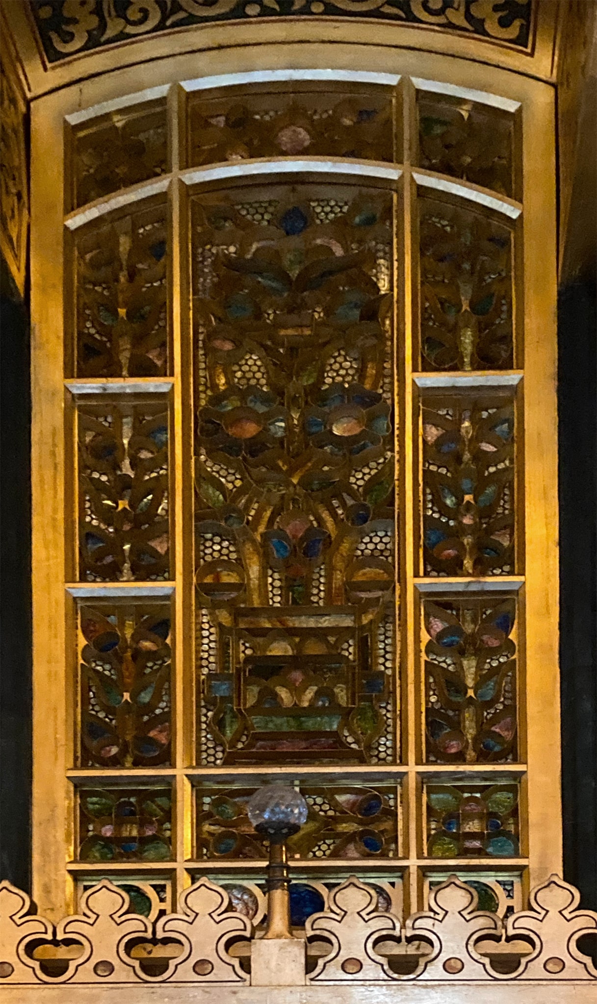 According to an undated report by Erfyl Ogwen Parry, assistant curator at Cardiff Castle, the windows of the Arab Room were probably executed by Worrell & Co., who in 1880 had taken over the glass firm Saunders & Co. from Burges’s old associate William Gualbert Saunders (1837–1923) (Parry, s.d., p. 5). Unlike the replicas mentioned above designed by Burges’s friend George Aitchison (1825–1910) for Leighton’s Arab Hall at Leighton House in London, the lattices of the Cardiff windows were made of wood. Parry states that the wooden grilles were most probably made together with the muqarnas ceiling and the mashrabīya shutters in the Bute Workshops, which had moved from Tyndall Street to Cardiff Castle in 1879 (Parry, s.d., p. 6).
