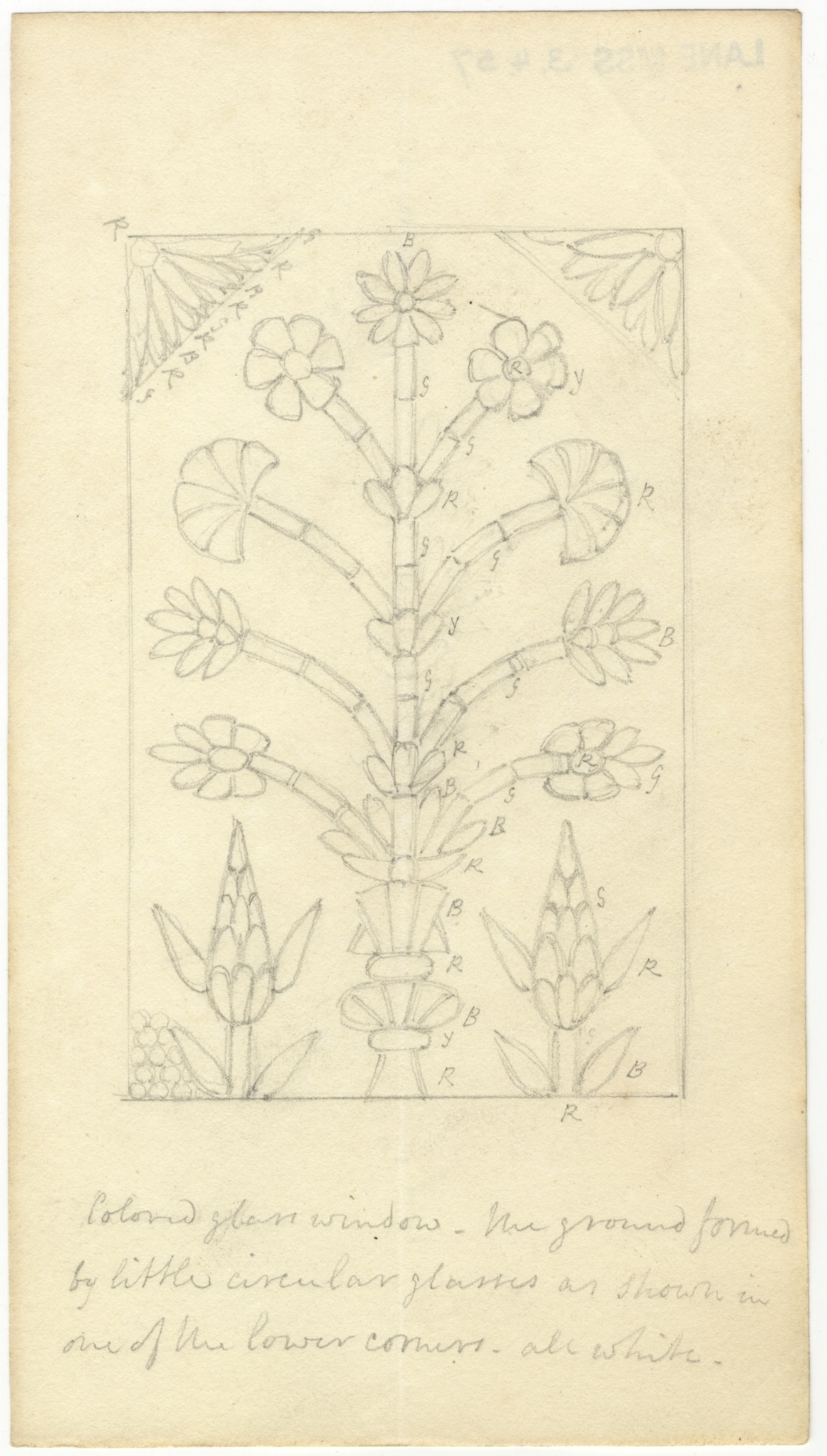 The British Orientalist Edward William Lane (1801–1876) depicted in this pencil drawing a rectangular stucco and glass window with the motif of flowers symmetrically disposed in a vase. The vase of flowers is flanked on each side by a small cypress tree. In the lower left corner of the drawing, small circles indicate the piercing of the stucco panel. Lane added letters to his drawing that may be abbreviations for the colours of the pieces of glass. A three-line inscription can be read underneath the window.