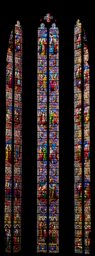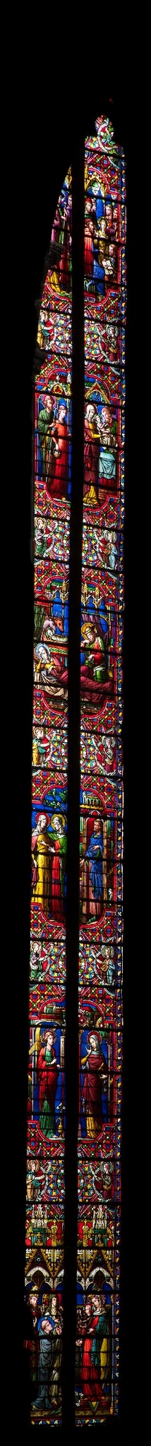 Zwischen den Bildszenen sind je zwei Engel mit Spruchbändern in Halbmedaillons dargestellt. Der Hintergrund (Grundfarbe Rot) und der schmale Rahmen sind mit farbigen geometrischen Motiven sowie Blatt- und Blütenornamenten im Stil der Gotik geschmückt. Im Vierpass, der die Lanzetten bekrönt, hält ein Engel eine Weltkugel (?) in den Händen (ange de la vie).