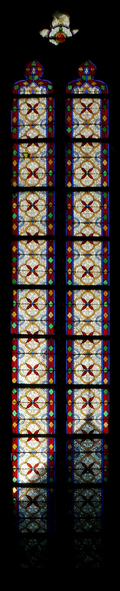 Zweilanzettiges, von einem Vierpass bekröntes Masswerkfenster. Der Fenstergrund ist mit einem sich wiederholenden geometrischen Muster (Halbkreise und Vierpässe mit eingeschriebener Blüte) und mit Grisaillemalerei (Blatt- und Blütenornamente) im Stil der Gotik gestaltet. Farbige Rhomben auf rotem Grund bilden die Rahmung. Grundfarben des Fensters: Weiss und Rot.
