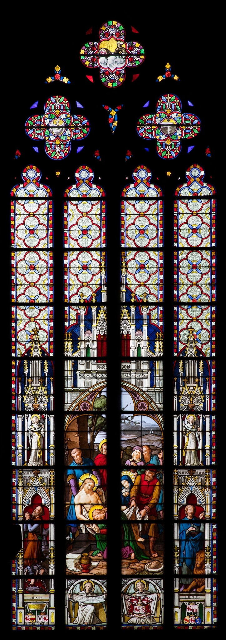 Masswerkfenster mit vier Lanzetten und Couronnement mit drei Vierpässen. In den beiden mittleren Lanzetten ist die 14. Station des Kreuzweges dargestellt: Der Leichnam Jesu wird im Beisein der Mutter und seiner Anhänger ins Grab gelegt. Im Hintergrund ist der Berg Golgatha mit den drei Kreuzen zu sehen. Im Vordergrund sind die Dornenkrone, ein Salbgefäss und ein Schwamm in einer Schüssel gezeigt. Die Bildszene ist von einer Rahmenarchitektur im Stil der Gotik gefasst, die mit Fialen bekrönt ist. In den beiden äusseren Lanzetten sind als zur Rahmenarchitektur gehörende Statuen zwei Engel mit Schriftbändern sowie Jona mit dem Walfisch und Daniel mit dem Löwen gezeigt. Der Sockel der Rahmenarchitektur ist mit einem Schriftband, Stifterwappen und zwei knienden Engeln geschmückt, die eine ausgerollte Schriftrolle und ein Tuch mit einem Wappen präsentieren. Das oberste Viertel der Lanzetten ist mit geometrischen Ornamenten, Grisaillemalerei und einer farbigen Rahmung mit Blatt- und Blütenmotiven gestaltet. In den Vierpässen sind der Walfisch Jonas sowie zwei Symbole der Passion (Grabtuch mit Christusmonogramm und ein Sarkophag) auf ornamentiertem Hintergrund dargestellt.