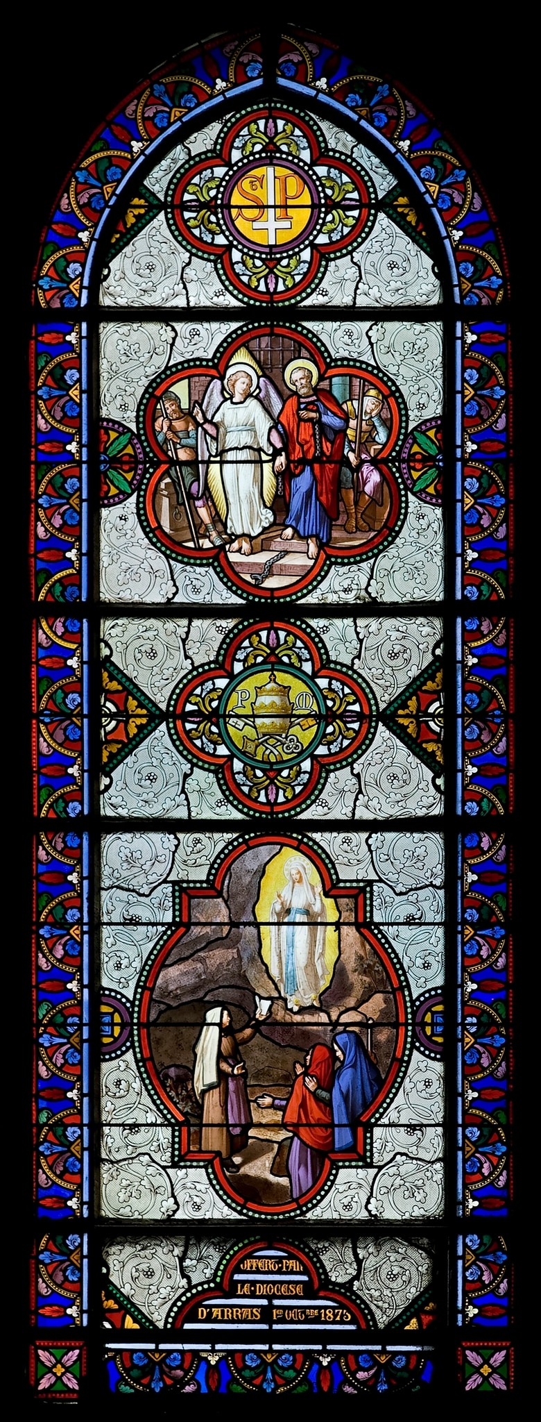 Eine von 41 Glasmalereien in der Basilika der Unbefleckten Empfängnis in Lourdes, die zu Ehren der Jungfrau Maria über der Grotte von Massabielle erbaut wurde. Dort soll die Jungfrau von Februar bis Juli 1858 insgesamt achtzehn Mal der 14-jährigen Bernadette Soubirous (1844–1879) erschienen sein. Die Glasmalereien der Kapellen in Langhaus und Chor berichten von diesen Erscheinungen und weiteren religiösen Höhepunkten in Lourdes Entwicklung zum wichtigsten Wallfahrtsort Frankreichs. Sie werden nach Eintritt in die Kirche von links nach rechts im Uhrzeigersinn gelesen. Die Glasmalereien im Obergaden von Langhaus und Chor thematisieren den Glauben an die unbefleckte Empfängnis (immaculata conceptio), von biblischen Präfigurationen bis zur Verkündung des Dogmas durch Papst Pius IX. am 8. Dezember 1854: seine Bulle Ineffabilis Deus hielt fest, dass die Jungfrau Maria ohne den Makel der Erbsünde empfangenen worden sei. Die Fenster im Obergaden werden zuerst von links zum Chor hin gelesen und danach von rechts zum Chor hin. Durch die Orgel verdeckt ist das Rosenfenster mit Mariensymbolen (?) in der Hauptfassade.