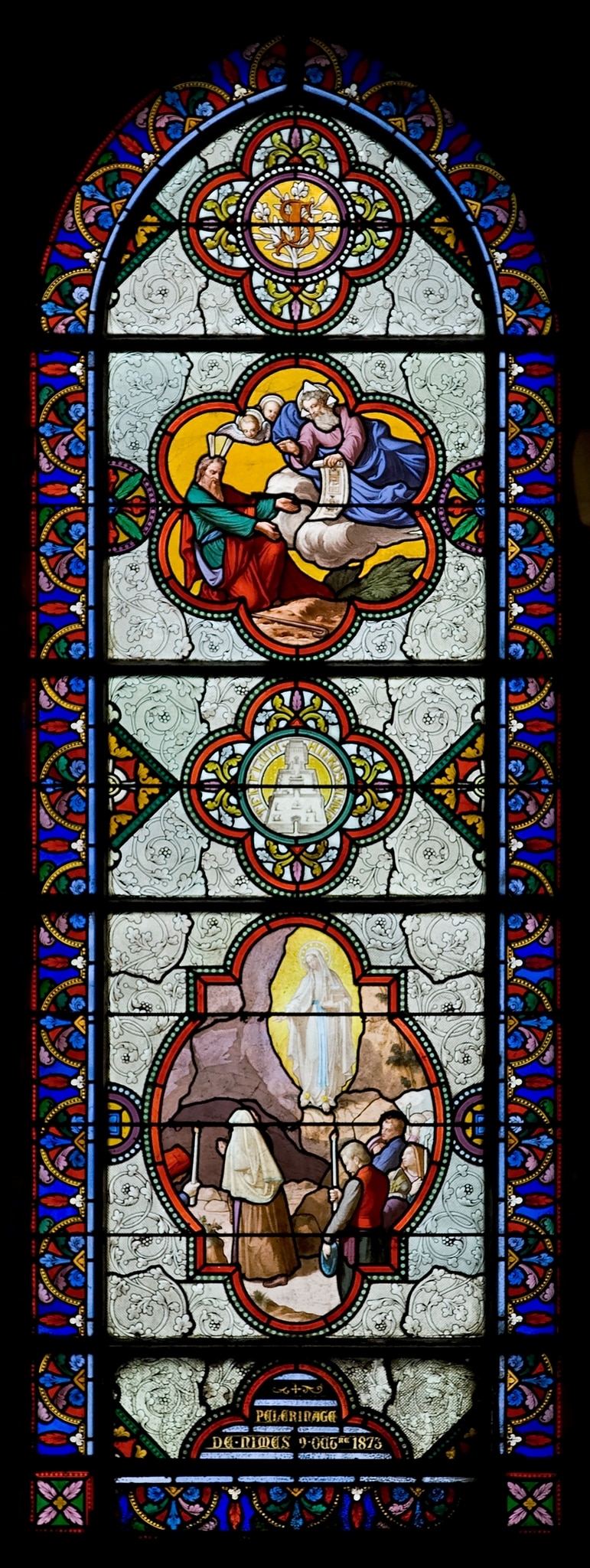 Eine von 41 Glasmalereien in der Basilika der Unbefleckten Empfängnis in Lourdes, die zu Ehren der Jungfrau Maria über der Grotte von Massabielle erbaut wurde. Dort soll die Jungfrau von Februar bis Juli 1858 insgesamt achtzehn Mal der 14-jährigen Bernadette Soubirous (1844–1879) erschienen sein. Die Glasmalereien der Kapellen in Langhaus und Chor berichten von diesen Erscheinungen und weiteren religiösen Höhepunkten in Lourdes Entwicklung zum wichtigsten Wallfahrtsort Frankreichs. Sie werden nach Eintritt in die Kirche von links nach rechts im Uhrzeigersinn gelesen. Die Glasmalereien im Obergaden von Langhaus und Chor thematisieren den Glauben an die unbefleckte Empfängnis (immaculata conceptio), von biblischen Präfigurationen bis zur Verkündung des Dogmas durch Papst Pius IX. am 8. Dezember 1854: seine Bulle Ineffabilis Deus hielt fest, dass die Jungfrau Maria ohne den Makel der Erbsünde empfangenen worden sei. Die Fenster im Obergaden werden zuerst von links zum Chor hin gelesen und danach von rechts zum Chor hin. Durch die Orgel verdeckt ist das Rosenfenster mit Mariensymbolen (?) in der Hauptfassade.