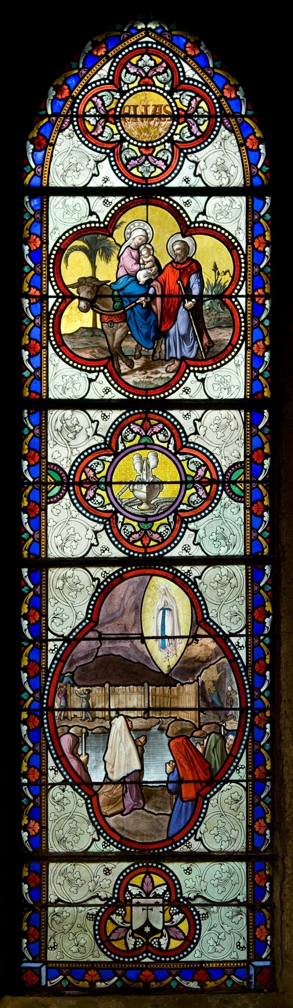 Eine von 41 Glasmalereien in der Basilika der Unbefleckten Empfängnis in Lourdes, die zu Ehren der Jungfrau Maria über der Grotte von Massabielle erbaut wurde. Dort soll die Jungfrau von Februar bis Juli 1858 insgesamt achtzehn Mal der 14-jährigen Bernadette Soubirous (1844–1879) erschienen sein. Die Glasmalereien der Kapellen in Langhaus und Chor berichten von diesen Erscheinungen und weiteren religiösen Höhepunkten in Lourdes Entwicklung zum wichtigsten Wallfahrtsort Frankreichs. Sie werden nach Eintritt in die Kirche von links nach rechts im Uhrzeigersinn gelesen. Die Glasmalereien im Obergaden von Langhaus und Chor thematisieren den Glauben an die unbefleckte Empfängnis (immaculata conceptio), von biblischen Präfigurationen bis zur Verkündung des Dogmas durch Papst Pius IX. am 8. Dezember 1854: seine Bulle Ineffabilis Deus hielt fest, dass die Jungfrau Maria ohne den Makel der Erbsünde empfangenen worden sei. Die Fenster im Obergaden werden zuerst von links zum Chor hin gelesen und danach von rechts zum Chor hin. Durch die Orgel verdeckt ist das Rosenfenster mit Mariensymbolen (?) in der Hauptfassade.