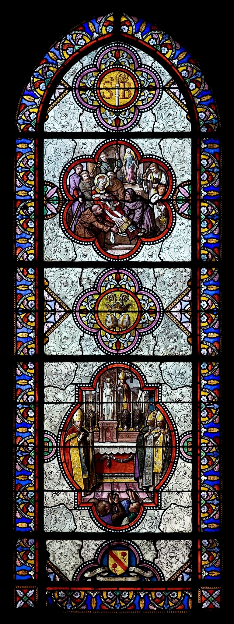 Spitzbogenfenster mit fünf übereinander angeordneten Medaillons. Das grösste Medaillon im unteren Bereich des Fensters ist Teil einer Chronik der Marienerscheinungen von Lourdes und dessen anschliessender Entwicklung zum Wallfahrtsort (1858–1876). Hier ist die Krönung der Marienstatue auf dem Vorplatz in Lourdes durch Kardinal Pier Francesco Meglia, Nuntius des Heiligen Stuhles in Frankreich in Anwesenheit mehrerer Bischöfe, etwa César-Victor Jourdan, Bischof von Tarbes, am 3. Juli 1876 dargestellt. Im oberen Bereich des Fensters ist in einem Sechspass die Beisetzung des heiligen Bertrand von Comminges vor dem Marienaltar seiner Kathedrale gezeigt. Darüber erscheint in einem Vierpass das mit einem Krummstab geschmückte Monogramm des Heiligen, dem auch die Kapelle gewidmet ist, in der sich das Fenster befindet. Der stehende Vierpass im Zentrum des Fensters ist mit zwei Mitren, zwei Krummstäben und einer Krone geschmückt, erinnernd an das Episkopat des heiligen Bertrand von Comminges und dasjenige von Bertrand-Sévère Laurence, Bischof von Tarbes zur Zeit der Marienerscheinungen in Lourdes. Am Fuss des Fensters halber Vierpass mit Stifterwappen und -inschrift. Die Medaillons liegen auf einem mit Blüten- und Blattranken in Grisaille dekorierten Grund; ein im Stil der Gotik mit farbigen Blattornamenten gestalteter Rahmen fasst das Fenster ein.