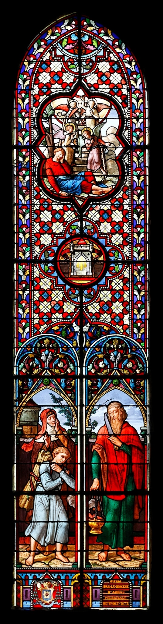 Spitzbogenfenster mit einer Bildszene in der unteren Hälfte des Fensters und darüber zwei Bildmedaillons auf einem im Stil der Gotik ornamentierten farbigen Hintergrund. Das Fenster ist Teil eines Zyklus zum Dogma der Unbefleckten Empfängnis Marias (immaculata conceptio). Der Zyklus thematisiert einerseits die Ankündigung des Mysteriums durch Präfigurationen Marias, und andererseits den Glauben an das Mysterium von seinen Anfängen bis zur Verkündung des Dogmas durch Papst Pius IX. am 8. Dezember 1854. Hier ist prominent Abrahams Aufbruch zur Opferung seines Sohnes Isaak dargestellt (Gen 22, 3–5). Abraham hält einen Feuerkessel und ein Messer in den Händen, Isaak das Feuerholz. Hinter Isaak ist die trauernde Mutter Sara zu sehen, eine Präfiguration Marias. Die Bildszene ist über einem architektonischen Sockel mit Stifterwappen und Stifterinschrift platziert und von schmalen Säulen und Baldachinen mit Blattranken-Dekor eingerahmt. Darüber erscheint in einem kleinen Medaillon das Himmelstor, ein Mariensymbol. Im zweiten, darüberliegenden Medaillon ist der schlafende Jakob gezeigt, der im Traum die Himmelsleiter sieht, auf der Engel hoch- und niedersteigen (Gen 28, 10–15), in Analogie zur Vorstellung von Maria als Vermittlerin zwischen Menschheit und Himmel.