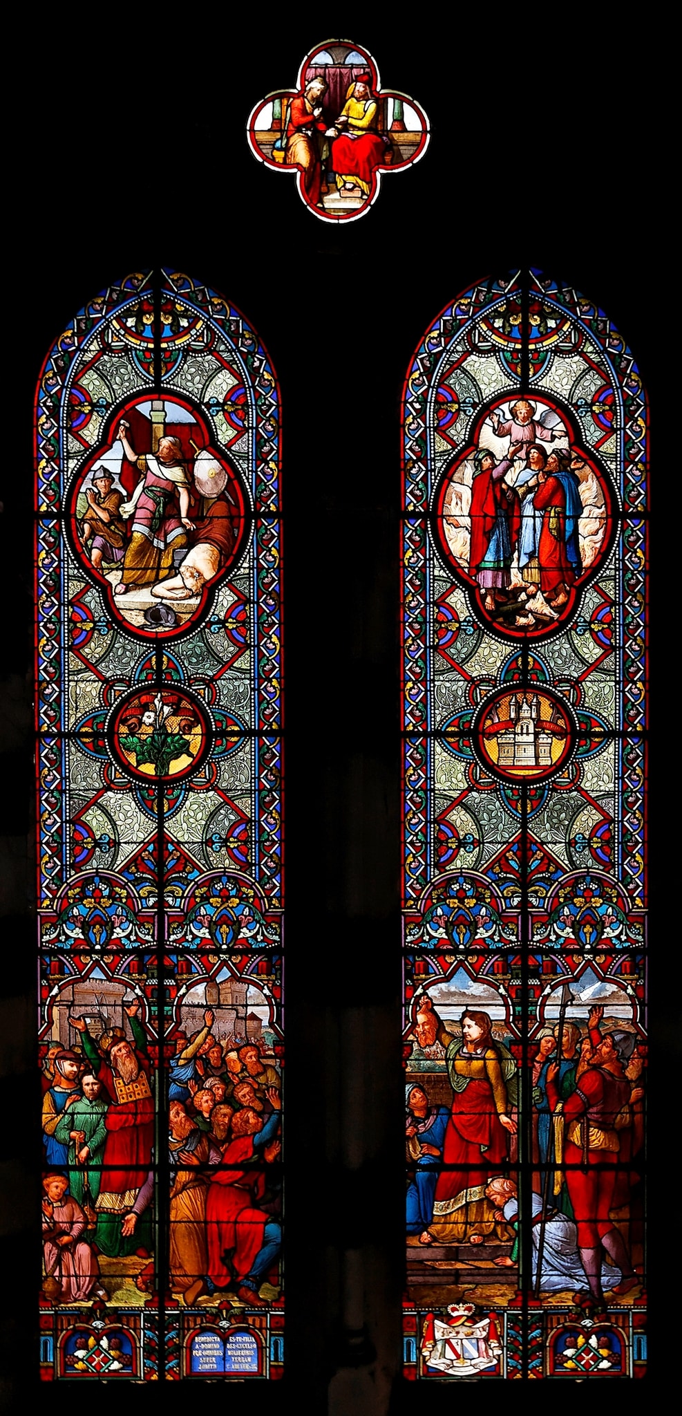 Zweilanzettiges Masswerkfenster mit Vierpass im Couronnement. Eine Bildszene nimmt die untere Hälfte des Fensters ein; darüber befinden sich in beiden Lanzetten je zwei Bildmedaillons auf einem im Stil der Gotik mit geometrischen Mustern und Blattranken in Grisaille dekorierten Hintergrund. Das Fenster ist Teil eines Zyklus zum Dogma der Unbefleckten Empfängnis Marias (immaculata conceptio). Der Zyklus thematisiert einerseits die Ankündigung des Mysteriums durch Präfigurationen Marias, und andererseits den Glauben an das Mysterium von seinen Anfängen bis zur Verkündung des Dogmas durch Papst Pius IX. am 8. Dezember 1854. Hier ist prominent Judith dargestellt, die ihrem belagerten Volk und dem Hohepriester den Kopf des Feldherren Holofernes präsentiert und für ihre kühne Tat gepriesen wird (Jdt 13, 11–20). Die Bildszene ist über einem architektonischen Sockel mit Stifterwappen und Inschrift platziert und von schmalen Säulen und stilisierten Baldachinen mit Blattdekor eingerahmt. Darüber erscheinen in kleinen Medaillons zwei Mariensymbole: links die von Dornenrosen umgebene Lilie, rechts der Elfenbeinturm. In den darüberliegenden Medaillons ist links Jaël gezeigt, die Sisera tötet (Ri 5, 24–28). Wie Judith gilt auch Jaël als Befreierin Israels und damit als Präfiguration der Jungfrau Maria. Rechts sind die drei Männer im Feuerofen zu sehen, die durch den Engel des Herrn gerettet werden (Dan 3, 1–30). Im Vierpass des Couronnement thront König Salomon, der seine Mutter Bathseba dazu einlädt, sich auf einen zweiten Thron neben ihn zu setzen, in Analogie zur Krönung Marias durch Jesus Christus.