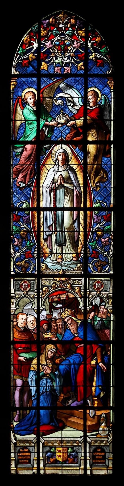 Eine von 41 Glasmalereien in der Basilika der Unbefleckten Empfängnis in Lourdes, die zu Ehren der Jungfrau Maria über der Grotte von Massabielle erbaut wurde. Dort soll die Jungfrau von Februar bis Juli 1858 insgesamt achtzehn Mal der 14-jährigen Bernadette Soubirous (1844–1879) erschienen sein. Die Glasmalereien der Kapellen in Langhaus und Chor berichten von diesen Erscheinungen und weiteren religiösen Höhepunkten in Lourdes Entwicklung zum wichtigsten Wallfahrtsort Frankreichs. Sie werden nach Eintritt in die Kirche von links nach rechts im Uhrzeigersinn gelesen. Die Glasmalereien im Obergaden von Langhaus und Chor thematisieren den Glauben an die unbefleckte Empfängnis (immaculata conceptio), von biblischen Präfigurationen bis zur Verkündung des Dogmas durch Papst Pius IX. am 8. Dezember 1854: seine Bulle Ineffabilis Deus hielt fest, dass die Jungfrau Maria ohne den Makel der Erbsünde empfangenen worden sei. Die Fenster im Obergaden werden zuerst von links zum Chor hin gelesen und danach von rechts zum Chor hin. Durch die Orgel verdeckt ist das Rosenfenster mit Mariensymbolen (?) in der Hauptfassade.