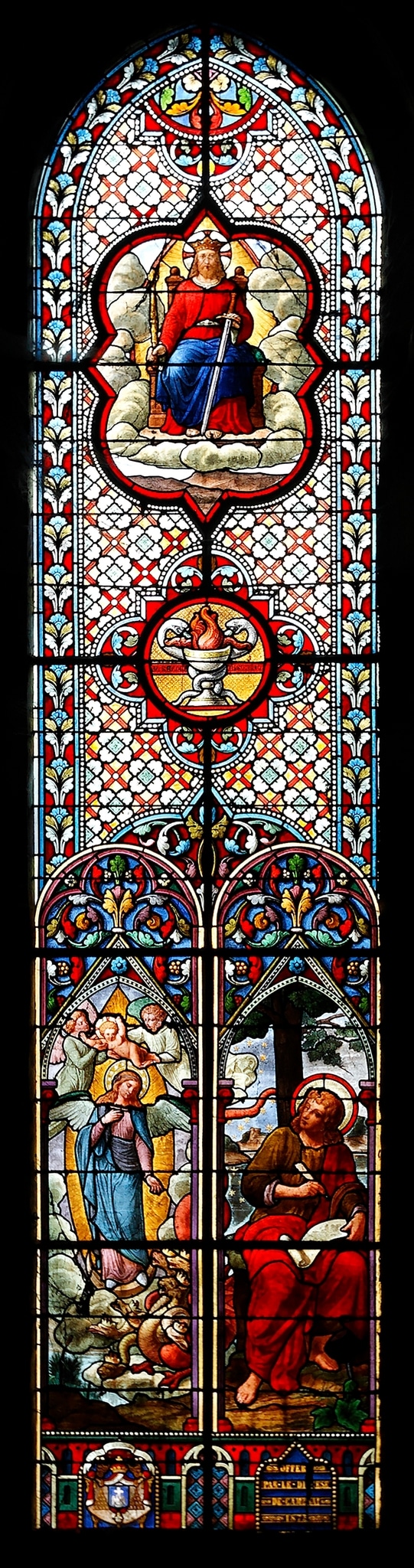 Spitzbogenfenster mit einer Bildszene in der unteren Hälfte des Fensters und darüber zwei Bildmedaillons auf einem im Stil der Gotik ornamentierten farbigen Hintergrund. Das Fenster ist Teil eines Zyklus zum Dogma der Unbefleckten Empfängnis Marias (immaculata conceptio). Der Zyklus thematisiert einerseits die Ankündigung des Mysteriums durch Präfigurationen Marias, und andererseits den Glauben an das Mysterium von seinen Anfängen bis zur Verkündung des Dogmas durch Papst Pius IX. am 8. Dezember 1854. Hier ist prominent Johannes auf Patmos dargestellt, der die Visionen der Offenbarung aufschreibt. Die Feder in der Hand und eine Schriftrolle auf den Knien blickt Johannes zur apokalyptischen Frau, die ihm als Jungfrau Maria mit Flügeln in einer leuchtenden Mandorla und mit einem Heiligenschein mit zwölf Sternen erscheint (Offb 12, 1–4). Maria steht auf einem Halbmond über einem Drachen mit sieben Köpfen; über ihr tragen zwei Engel das Jesuskind. Die Bildszene ist über einem architektonischen Sockel mit Stifterwappen und Stifterinschrift platziert und von schmalen Säulen und Baldachinen mit Blattranken-Dekor eingerahmt. Darüber erscheint in einem kleinen Medaillon ein brennender Kelch mit zwei Schlangen, die an den Flammen lecken; ein Symbol für die Unreinheit, von der Maria verschont wurde (Offb 17, 4). Im zweiten, darüberliegenden Medaillon ist der thronende Jesus Christus als Weltenherrscher mit Zepter und Schwert gezeigt.