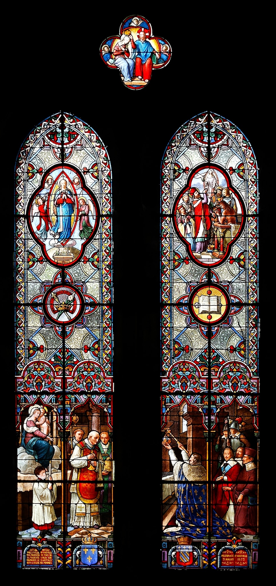 Zweilanzettiges Masswerkfenster mit Vierpass im Couronnement. Eine Bildszene nimmt die untere Hälfte des Fensters ein; darüber befinden sich in beiden Lanzetten je zwei Bildmedaillons auf einem im Stil der Gotik mit geometrischen Mustern und Blattranken in Grisaille dekorierten Hintergrund. Das Fenster ist Teil eines Zyklus zum Dogma der Unbefleckten Empfängnis Marias (immaculata conceptio). Der Zyklus thematisiert einerseits die Ankündigung des Mysteriums durch Präfigurationen Marias, und andererseits den Glauben an das Mysterium von seinen Anfängen bis zur Verkündung des Dogmas durch Papst Pius IX. am 8. Dezember 1854. Hier ist prominent dargestellt wie Ludwig XIII. 1638 in einem Gelübde sein Königreich der Jungfrau Maria weiht. Der König kniet in einem blauen, mit goldenen Lilien besetzten Mantel vor dem Altar der Kirche in Abbeville, auf dem Maria mit dem Kind in einer Wolke schwebend erscheint. Er reicht Frankreichs Schutzpatronin Krone und Zepter, bevor er die Kommunion empfängt. Beim Altar stehen mehrere Geistliche und ein Ministrant, hinter dem König knien Kardinal Richelieu und weitere Würdenträger; dahinter stehen zwei Soldaten. Die Bildszene ist über einem architektonischen Sockel mit Stifterwappen und Stifterinschrift platziert und von schmalen Säulen und stilisierten Baldachinen mit Blattdekor eingerahmt. Darüber erscheinen in kleinen Medaillons rechts ein offenes Buch mit dem Schriftzug «Magnificat», dem Beginn des Lobgesangs Marias, und links eine Krone mit Lilienzepter und Lilie, ein Symbol für Frankreich als Königreich Marias. In den darüberliegenden Medaillons ist links die blau gekleidete Jungfrau Maria zu sehen, die in einer von Engeln getragenen Mandorla über dem mit Blumen gefüllten Grab zum Himmel aufsteigt – ein Verweis auf die Prozessionen zum Fest Mariä Himmelfahrt, die durch das Gelübde von Ludwig XIII. eingeführt wurden. Rechts ist die Taufe des fränkischen Königs Chlodwig I. in Reims durch Bischof Remigius gezeigt. Während des feierlichen Aktes hat der Bischof eine Vision: Die in einer Mandorla erscheinende Jungfrau Maria zeigt ihm die künftigen Könige Karl der Grosse und Ludwig IX. und kündet damit die Kreuzzüge an. Neben Maria schwebt die Taube mit der Ampulle mit dem heiligen Salböl; links vorne kniet Chrodechild (Sainte Clotilde), die Ehefrau Chlodwigs. Im Vierpass des Couronnement thront Jesus Christus, der seine neben ihm sitzende Mutter krönt. In den Pässen drei geflügelte Engelsköpfe.
