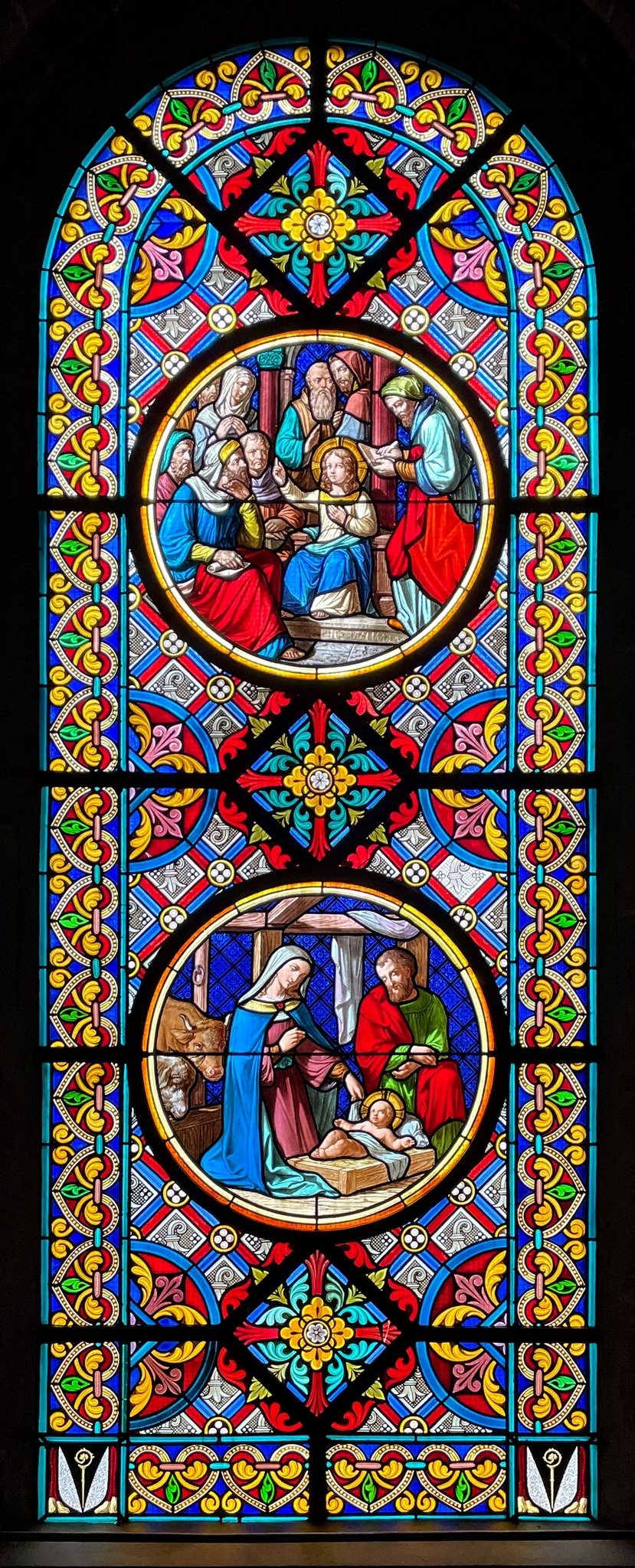 Die Ausführung der Glasmalereien für die vier romanischen Rundbogenfenster im Chorumgang und für das Westfenster des Basler Münsters wurde dem in Paris arbeitenden St. Galler Caspar Gsell übertragen, dem künstlerischen Leiter der Firma Laurent, Gsell et Cie., der in der Schweiz durch sein frühes monumentales Bildfenster für die Laurenzenkirche in St. Gallen (CG_63, 1853) auf sich aufmerksam gemacht und 1855 mehrere Glasmalereien und Zeichnungen an der Weltausstellung in Paris ausstellte (siehe Sanchez, 2005, S. 691 und 882). Kommissionsmitglied Merian-Von der Mühll besuchte diese Weltausstellung und knüpfte vor Ort Kontakt mit Gsell. Erste Ideen zur Gestaltung der Fenster sahen für das zentrale Fenster im Chorumgang eine Kreuzigungsgruppe mit Maria und Johannes, sowie seitlich Darstellungen von Auferstehung und Himmelfahrt Christi vor und damit «[…] drei Gegenstände, welche recht eigentlich die Summe unsrer evangelischen Lehre in sich fassen»; im Fenster über dem Grab der Königin Anna von Habsburg (um 1225–1281) sollte hingegen eine rein ornamentale Verglasung eingesetzt werden (siehe Beilage zur Nr. 109 des Allgemeinen Intelligenzblattes der Stadt Basel, 10. Mai 1855). Als alternative Möglichkeit betrachtete die Kirchenfenster-Kommission die Darstellung der Vita Christi «[…] vielleicht mehr in Übereinstimmung mit der Bauart mit neun Medaillons, wovon je drei die Jugend, die Passion und die Erscheinung Christi nach dem Tode darstellen könnten» (Staatsarchiv Basel-Stadt, Bau JJ 5, Zweite Anzeige die Fenstergemälde betreffend, 1855). Die Kommission entschied schliesslich zugunsten von Medaillonfenstern: auf einem Ornamentteppich sollten je zwei Bildmedaillons die Geburt Christi und den zwölfjährigen Christus im Tempel, das Abendmahl und die Kreuzigung – als wichtigste heilsgeschichtliche Ereignisse im zentralen, etwas grösseren Fenster –, sowie die Auferstehung und die Erscheinung Christi vor Maria Magdalena im Garten (Noli me tangere) zeigen (Staatsarchiv Basel-Stadt, PA 319 I D 1, Protokoll der Kommission zu den Kirchenfenstern des Münsters, 18. August 1855; siehe auch Vaassen, 1997, S. 50). Die gewählten Medaillonfenster entsprechen einer älteren Konzeption der Chorumgangsfenster, die in einem Holzschnitt in der Wurstisenschen Chronik (1580) dokumentiert ist (siehe Maurer, 1990, S. 250).