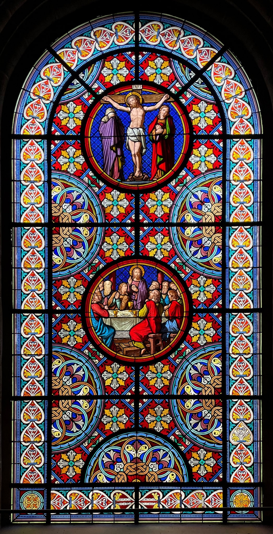 Rundbogenfenster mit zwei Bildmedaillons auf einem im Stil der Gotik farbig ornamentierten Grund. Das untere Medaillon zeigt das letzte Abendmahl (Mk 14, 17–25): Jesus Christus hat sich mit seinen Jüngern versammelt und steht, in der einen Hand das Brot haltend, die andere zum Segen erhoben, mit in die Ferne gerichtetem Blick am Tisch; die Jünger wenden sich ihm betend zu, ein umgestürzter Hocker im Vordergrund verweist auf den abwesenden Judas. Im oberen Medaillon ist auf blauem Rautengrund die Kreuzigung dargestellt (Joh 19, 26–27): der dornengekrönte Jesus Christus hängt, nur mit einem Lendentuch bekleidet, am Kreuz; links verbirgt seine trauernde Mutter Maria ihr Gesicht in den Falten ihres Mantels, rechts steht der vom Schmerz gezeichnete Lieblingsjünger Johannes mit vor der Brust gekreuzten Händen. Die übrige Fensterfläche ist mit halben Medaillons mit stilisierten Band- und Blattornamenten auf einem farbigen Teppichmuster sowie einem breiten Rahmen aus Herz- und Palmettenmotiven gestaltet. Am unteren Rand des Fensters Stifterinschrift.
