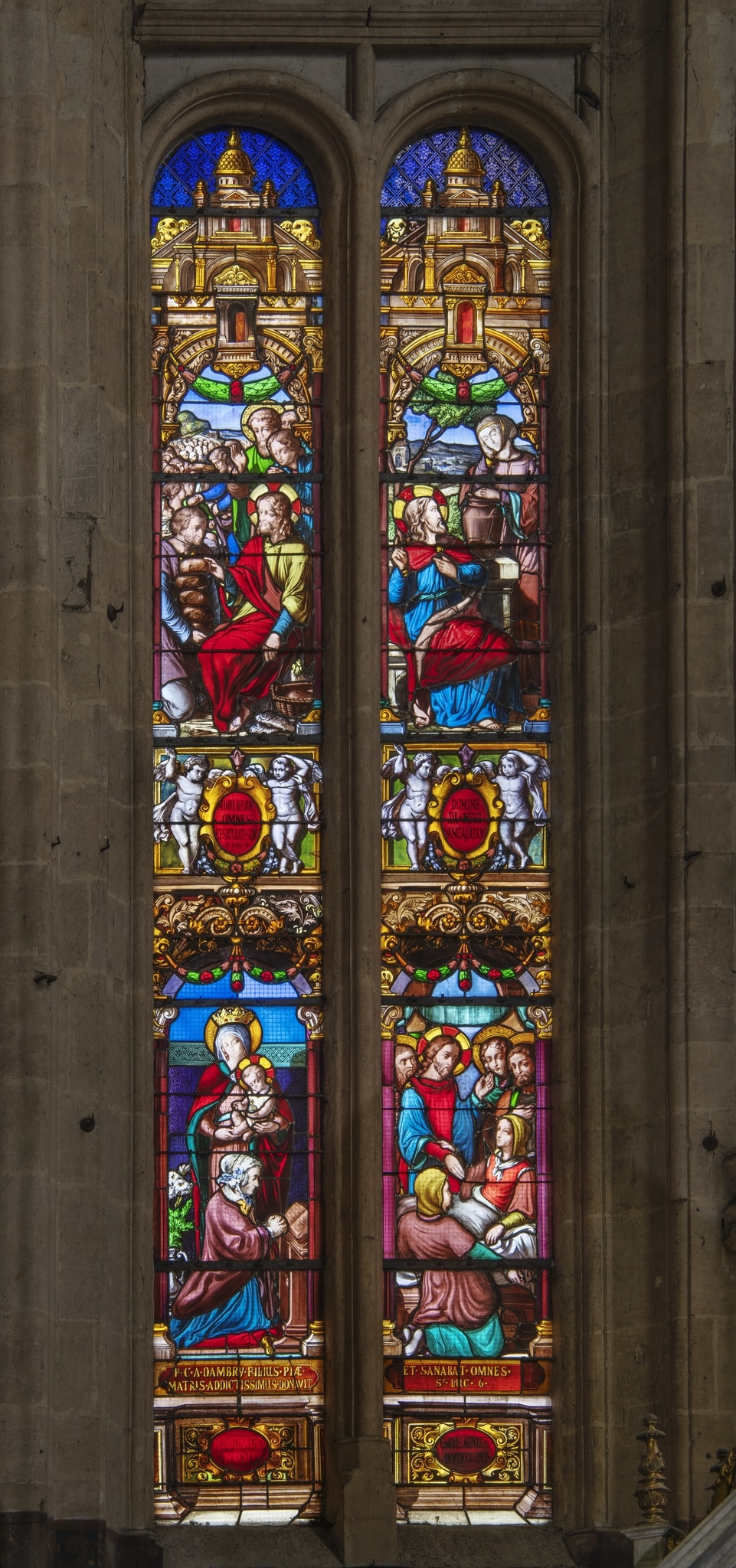 Masswerkfenster mit zwei in Rundbogen endenden Lanzetten. Pro Lanzette sind zwei Bildszenen gezeigt, analog zu s II (CG_75). Links unten ist Madame Dambry, die Mutter des Stifters, im Gebet kniend dargestellt. Hinter ihr steht ihre Schutzpatronin, die gekrönte Muttergottes mit dem Jesuskind auf dem Arm. Das darüberliegende Bild zeigt die wundersame Vermehrung von Brot und Fisch (Mt 14, 16–21). Jesus nimmt fünf Brotleibe entgegen, um sie durch seine Jünger unter einer Menge von mehreren tausend Leuten verteilen zu lassen. Zu seinen Füssen liegen zwei Fische. In der rechten Lanzette ist unten eine Krankenheilung gezeigt. Ein bereits tot geglaubtes Mädchen wacht auf, als Jesus mit seinen Jüngern an das Bett tritt, vor dem die Mutter kniet (Lk 8, 40–56). Darüber ist zuletzt Jesus am Brunnen Jakobs dargestellt, die Samariterin um Wasser bittend, welches sie geschöpft hat (Jh 4, 1–22). Die Bildszenen, von denen drei Werke der Barmherzigkeit zeigen, sind von Architekturrahmen im Stil der Renaissance gefasst. Die architektonischen Sockel sind mit Schriftkartuschen und Putten besetzt, die Baldachine mit Girlanden behängt.