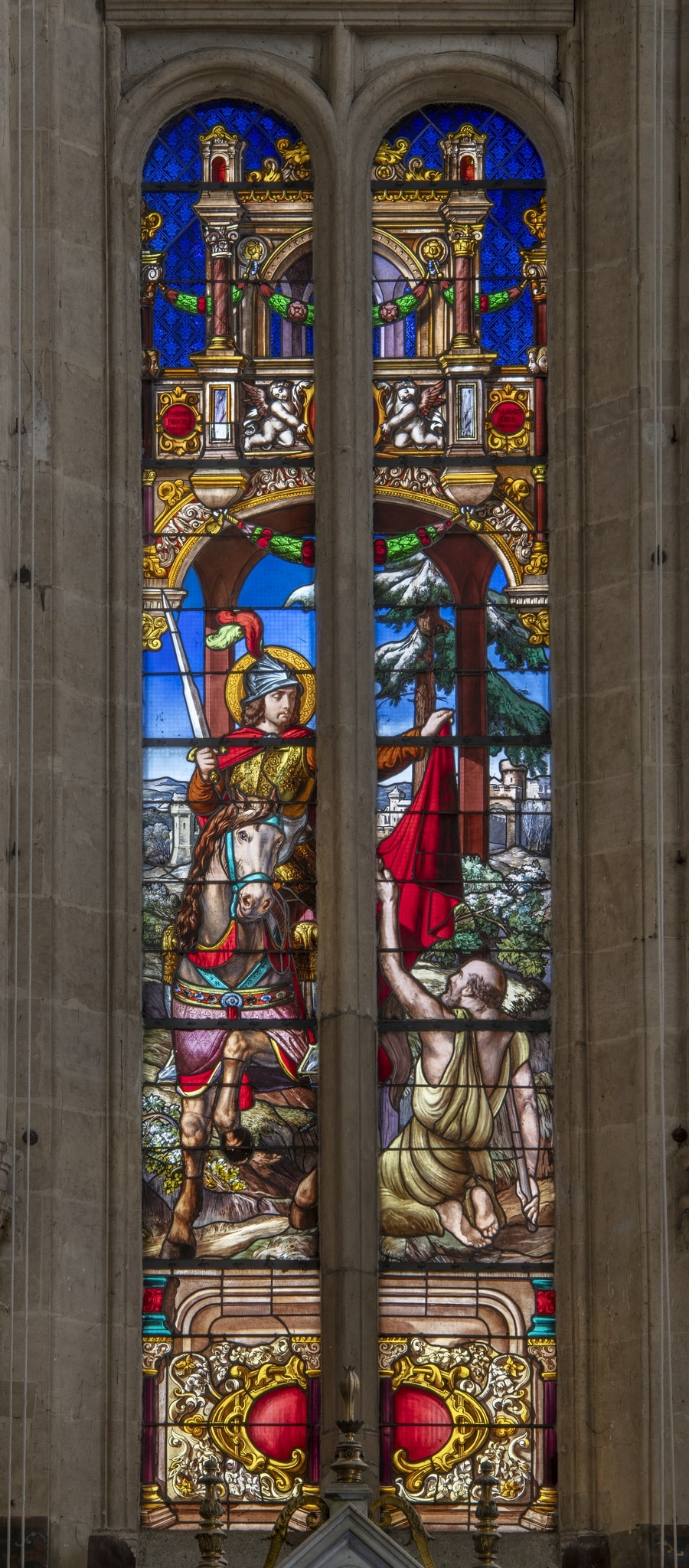 Masswerkfenster mit zwei in Rundbogen endenden Lanzetten. In den drei zentralen Registern ist der heilige Martin von Tours als geharnischter Soldat der kaiserlichen römischen Garde auf einem reich geschmückten Pferd dargestellt. Er hat mit dem Schwert seinen Mantel geteilt und reicht das abgetrennte Stück einem vor ihm knienden, frierenden Mann. Im Hintergrund sind – als Hinweis auf das winterliche Amiens, in dem sich die Szene im 4. Jahrhundert abgespielt haben soll – eine schneebedeckte Tanne und eine Stadt gezeigt. Die Bildszene, die ein Werk der Barmherzigkeit zeigt, wird von einem girlandenbehängten Renaissance-Baldachin mit Putten und Inschriftenkartuschen überfasst. Den unteren Abschluss bildet ein mit einer Kartusche und Blattranken geschmückter architektonischer Sockel.