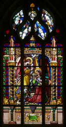 Dreilanzettiges Masswerkfenster mit einer Darstellung der Verkündigung in den Lanzetten. Eingefasst von einem neugotischen architektonischen Rahmen ist Maria in einem Innenraum kniend gezeigt. Über ihrem Haupt schwebt als Taube der Heilige Geist, während links neben ihr der Engel mit einem Strauss weisser Lilien an sie herantritt. Der übrige Bereich der Lanzetten ist mit Ornamenten in Grisaille und mit farbigen Blattmustern (Rahmen und Medaillons) gestaltet. Masswerk mit farbigen Ranken und Marienmonogramm.