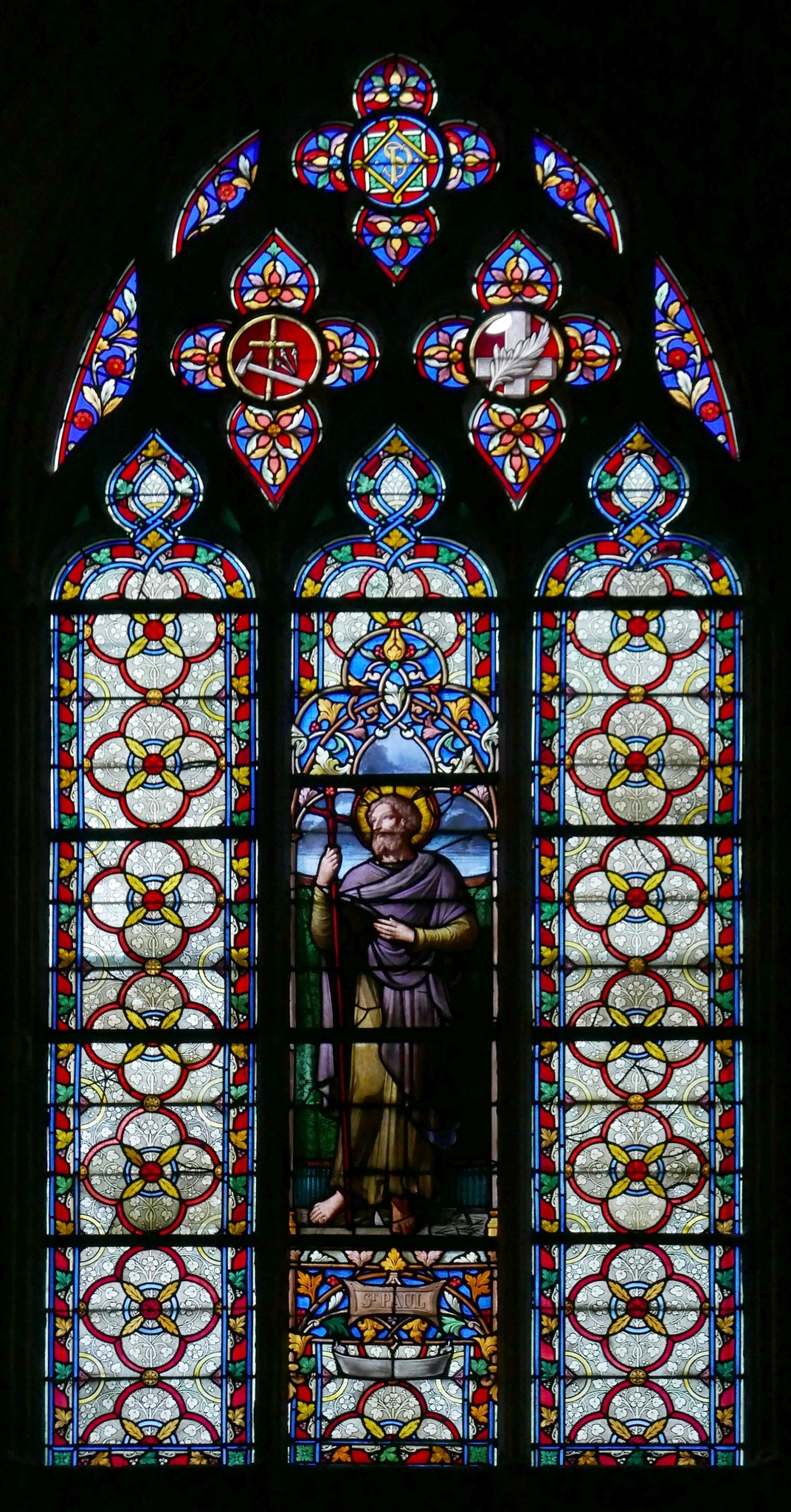 Eine von fünf Glasmalereien im südlichen Seitenschiff der Kirche Saint-Vivien in Rouen (CG_157–CG_161), die 1875 gestiftet wurden und aus dem Glasmalerei-Atelier Gsell-Laurent in Paris stammen. Vier dieser Fenster zeigen Heiligenfiguren, während das fünfte, über dem Seitenportal angebrachte, mit Christussymbolen geschmückt ist.