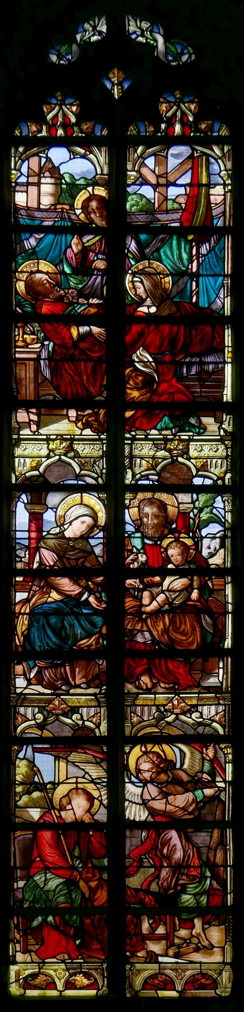 Zweilanzettiges Masswerkfenster mit drei übereinander angeordneten Bildszenen zur Vita des heiligen Joseph. Zuunterst ist die Verkündigung an Joseph gezeigt (Mt 1, 20–21). Dem in seiner Werkstatt schlafenden Joseph erscheint ein Engel, der ihn auffordert, die bereits schwangere Maria zu heiraten, und dem vom Heiligen Geist empfangenen Kind den Namen Jesus zu geben. In der mittleren Szene ist die heilige Familie dargestellt; Joseph trägt das Jesuskind auf seinem Schoss, Maria reicht dem Kind eine weisse Lilie. Zuoberst ist der Tod Josephs gezeigt. Joseph liegt in einem halboffenen, mit Tüchern begrenzten Raum auf seinem Bett; Maria kniet zu seiner Seite, Jesus steht neben seinem Vater und segnet ihn. Die drei Bildszenen sind von schmalen architektonischen Rahmen mit Dekor in Stil der Gotik gefasst. Masswerkfüllungen mit weissen Lilien.