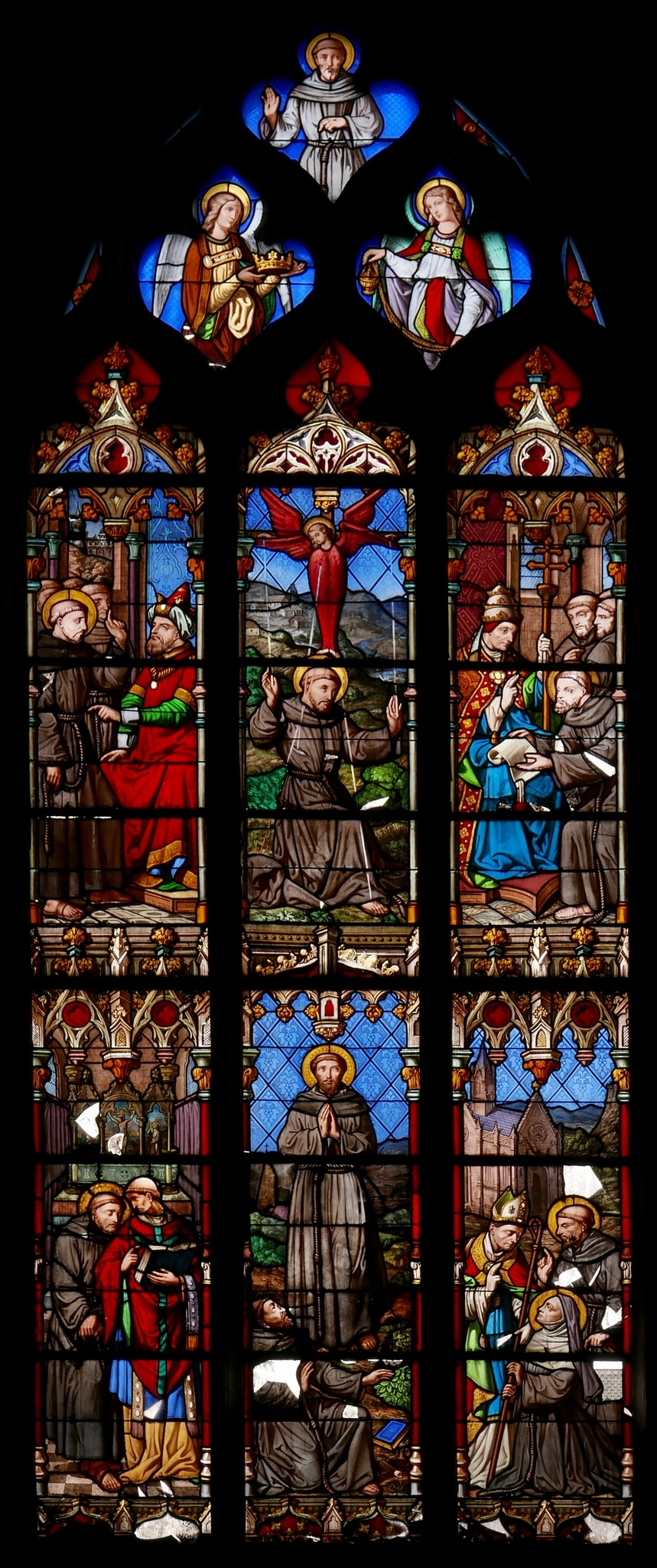 Dreilanzettiges Masswerkfenster mit sechs Bildszenen zur Vita des heiligen Franziskus von Assisi: Franziskus diskutiert mit einem Priester in einer Kirche eine Bibelstelle, im Hintergrund ist ein Altar mit einer Kreuzigungsszene zu sehen (1a–3a); Franziskus steht beim Gebet in San Damiano unter freiem Himmel, ihm zu Füssen kniet neben einem Buch ein weiterer Mann in einer mit einem Strick gehaltenen grauen Kutte, vermutlich der erste Anhänger des Franziskus (1b–3b); Franziskus und die heilige Klara werden von einem Bischof gesegnet, im Hintergrund ist eine Kirche zu sehen, ev. das Kirchlein Portiuncula (1c–3c); der Ordensgründer Franziskus predigt mit seinen Mitbrüdern vor einem thronenden, reich gekleideten Mann, vermutlich Sultan Al-Malik al-Kamil, den er 1219 während des Kreuzzugs von Damiette in Ägypten traf (4a–6a); auf dem Berg Alverna erscheint Franziskus ein gekreuzigter Mann – einem Seraphen gleich – mit sechs Flügeln, von dem er die Stigmata der Passion Christi empfängt (4b–6b); Franziskus kniet begleitet von zwei Mitbrüdern mit einem Schriftstück in der Hand vor dem Papst Honorius III., der 1223 die Ordensregel der Franziskaner mit der päpstlichen Bulle «Solet annuere» genehmigt (4c–6c). Alle Szenen sind durch architektonische Rahmen mit Dekor im Stil der Gotik gefasst. Masswerkfüllungen mit den Halbfiguren von zwei Engeln, die in ihren Händen eine Krone und ein Weihrauchfass halten, darüber Franziskus, die eine Hand zum Segen erhoben.