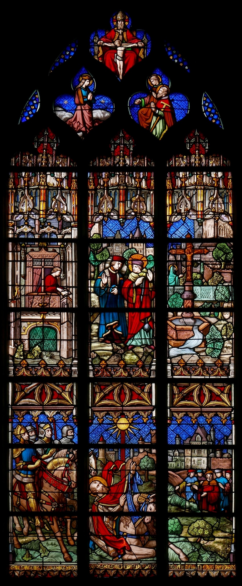 Dreilanzettiges Masswerkfenster mit zwei übereinander angeordneten Bildszenen zur Vita zweier Heiliger. Unten ist eine Schlüsselszene der Berufung des heiligen Paulus von Tarsus zu sehen. Auf dem Weg nach Damaskus wird der Christenverfolger Saulus/Paulus von einer Lichterscheinung Christi geblendet (Apg 9, 3–29). Den Blick zum Licht gewendet, die Arme erhoben, ist Paulus auf dem gestürzten Pferd gezeigt. Links sind vier weitere gerüstete Männer auf Pferden dargestellt, rechts eine Männergruppe, vermutlich Anhänger Christi. Im Hintergrund sind die Gebäude und Türme einer Stadt zu erkennen. Die obere Bildszene thematisiert die Berufung des heiligen Augustinus von Hippo, der in eine Sinnkrise geraten ist, und im Garten zu Gott gesprochen hat. Links ist das Kind mit dem Buch gezeigt, dessen Stimme «Nimm, lies!» Augustinus vernimmt. In der Bildmitte diskutieren Augustinus und sein Freund Alypius, nachdem Augustinus die Stelle in den Paulusbriefen gelesen hat, die seine Bekehrung zum Christentum bewirkt. Links ist ein Garten dargestellt, in dem aus einem Brunnen mit Kruzifix eine Quelle entspringt. Im Hintergrund betet eine Frau, womöglich die Mutter von Augustinus oder dessen frühere Geliebte. Die Bildszenen sind durch architektonische Rahmen mit Dekor im Stil der Gotik gefasst. Masswerkfüllungen mit den Ganzfiguren einer knienden betenden Heiligen mit Krone sowie zweier kniender Mönche, einer davon der heilige Antonius. Darüber als Symbol der Dreifaltigkeit Gottvater und der Heilige Geist, den gekreuzigten Christus haltend.