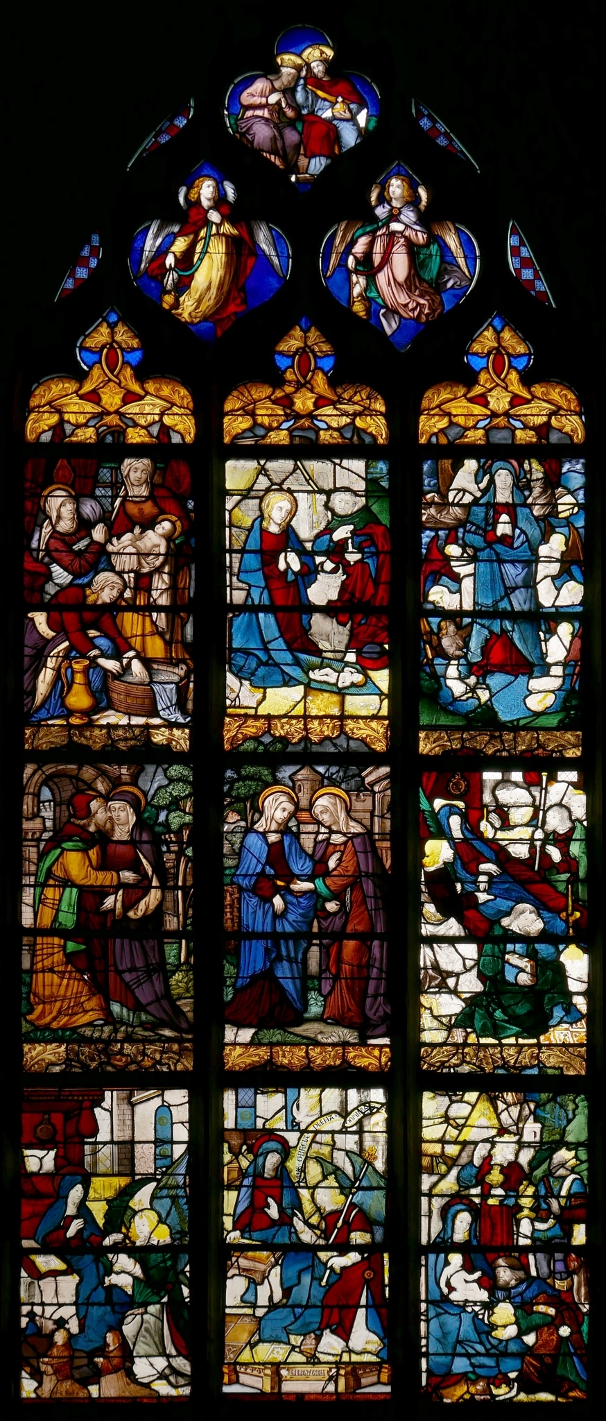 Dreilanzettiges Masswerkfenster mit neun nicht chronologisch angeordneten Bildszenen zur Vita der Jungfrau Maria: Ein Engel kniet in einem Innenraum vor Maria und verkündet ihr ihren bevorstehenden Tod; am unteren Rand der Bildszene knien zwei Personen, die die Stifter des Fensters darstellen (1a/2a); der Engel Gabriel mit Zepter verkündet der lesenden Maria, dass sie den Sohn Gottes vom Heiligen Geist empfangen und gebären werde, der Heilige Geist schwebt als Taube über Maria (1b/2b, Lk 1, 26–33); die Drei Könige beten das auf dem Schoss von Maria sitzende Christuskind an und übergeben ihm ihre Gaben (1c/2c, Mt 2, 1–11); Anna und Joachim, die zukünftigen Eltern von Maria, begegnen und umarmen sich vor der Goldenen Pforte in Jerusalem (3a/4a); die schwangere Maria besucht ihre Verwandte Elisabeth (Heimsuchung), die selbst mit Johannes dem Täufer schwanger ist; die beiden Frauen stehen sich gegenüber und berühren sich (3b/4b, Lk 1, 39–45); Maria liegt mit übereinander gelegten Händen auf dem Totenbett, umgeben von mehreren Aposteln, links ist vermutlich Johannes der Evangelist am Bett der Jungfrau dargestellt (3c/4c); Anna hat soeben ihre Tochter Maria geboren, zwei Frauen bereiten ein Bad für das Neugeborene, während die Mutter betend im Bett liegt (5a/6a); Maria und Joseph knien vor dem Jesuskind, das auf dem Mantel Marias schläft; zwischen ihnen sind die Köpfe von Esel und Ochse und im Hintergrund der Stall zu sehen (5b/6b, Lk 2, 1–20); Maria wird von Engeln zum Himmel emporgetragen (5c/6c). Die neun Bildszenen sind von Blattranken überfasst. Masswerkfüllungen mit zwei Weihrauchfässer schwenkenden Engeln und darüber die Krönung Marias durch Christus.