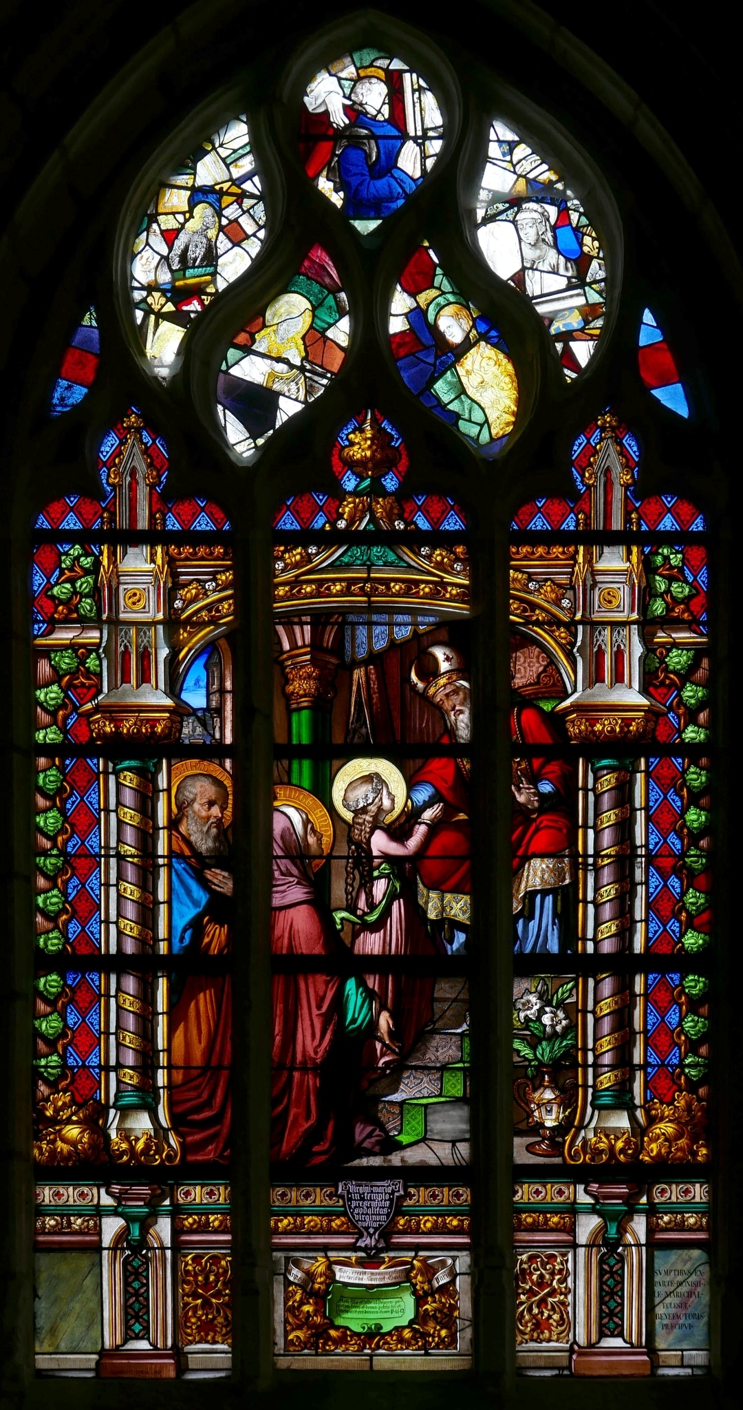 Masswerkfenster mit drei in Nonnenköpfen endenden Lanzetten, darüber Couronnement mit Flamboyant-Masswerk. In den drei Lanzetten ist die Präsentation der Maria im Tempel von Jerusalem gezeigt. Maria steht mit gefalteten Händen auf den Stufen vor einem reich gekleideten Priester, der sie segnet. Hinter ihr stehen die Eltern Anna und Joachim. Die Bildszene ist gefasst von einem reichen architektonischen Rahmen im Stil der Gotik und Renaissance (analog zum Fenster n IV). Im Sockel Schriftkartuschen mit Stifterinschrift und Signatur. Für die Masswerkfüllungen wurden Reste einer früheren Verglasung wiederverwendet.