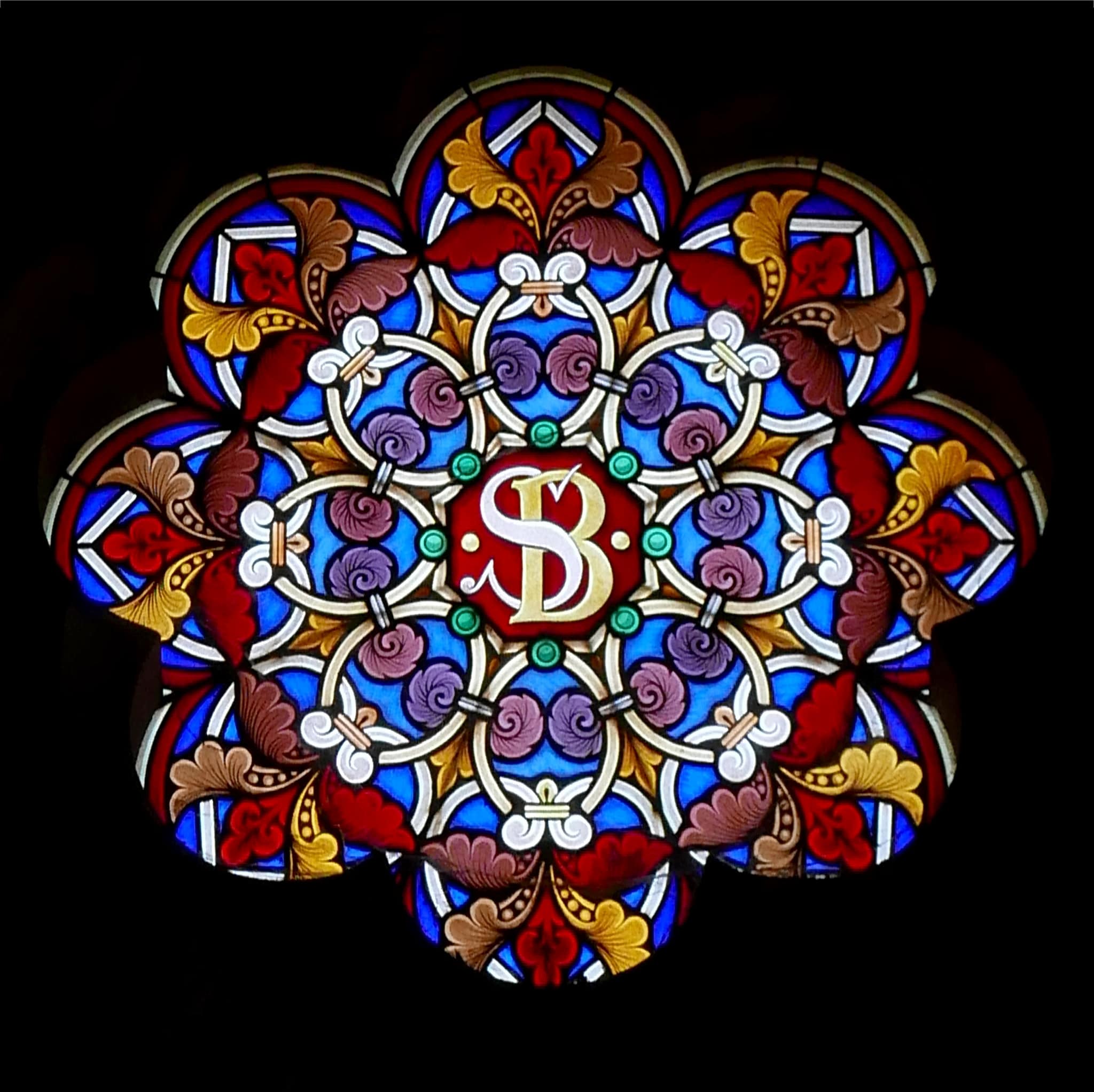 Achtpassfenster mit farbigem, kreisförmig angeordneten Blatt- und Rankendekor im Stil der Gotik. Grundfarben Blau, Rot, Gelb (identisch mit n III). Im Zentrum auf rotem Grund das verschlungene Monogramm SB für den heiligen Benedikt von Nursia.