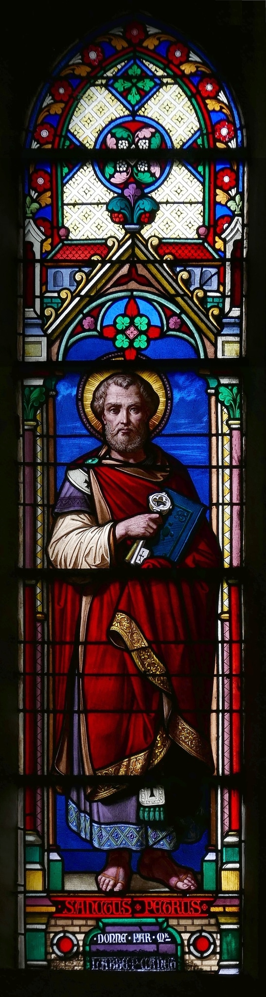 Spitzbogenfenster mit einer Darstellung des heiligen Petrus als Ganzfigur. Petrus trägt über dem Priestergewand einen roten Mantel und hält in seinen Händen ein Buch sowie den goldenen und den silbernen Schlüssel, die für das Himmelreich und das irdische Reich stehen. Der Heilige steht auf einem Sockel, der seinen Namenszug und die Stifterinschrift trägt. Petrus ist zudem eingefasst durch eine Säulenarchitektur mit Baldachin im Stil der Gotik. Die übrige Fensterfläche ist mit farbigen geometrischen Motiven und Blattmustern gestaltet.
