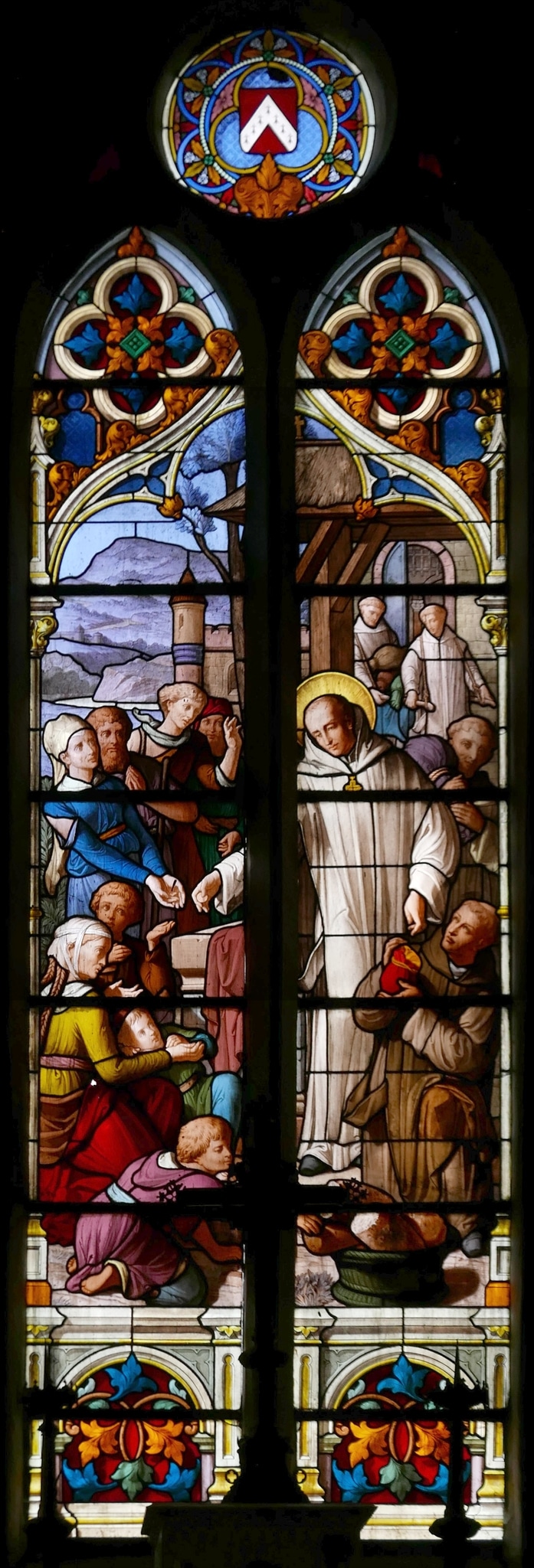 Zweilanzettiges Masswerkfenster mit einer Darstellung des heiligen Anthelm, der als Prior der Grande Chartreuse Almosen an Bedürftige verteilt. Im schlichten weissen Gewand der Karthäuser steht Anthelm an der Klosterpforte und verteilt Geldstücke aus einem Beutel, den ihm ein kniender Mönch hinhält. Auch ein Korb mit Brot steht bereit, in den bereits eines der anwesenden Kinder greift. Im Hintergrund sind drei Mönche zu sehen, die weitere Waren herantragen. Die Bildszene ist über einem architektonischen Sockel platziert und von schmalen Säulen flankiert, über denen sich ein Baldachin im Stil der Neugotik erhebt. In der kreisrunden Öffnung des Couronnement ist in einem Sechspass mit Blattornamenten das in einen Dreipass eingeschriebene Wappen der Gemeinde Chignin, Geburtsort von Anthelm, gezeigt.