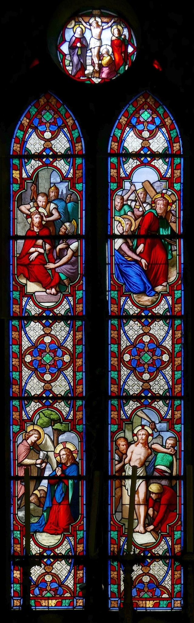 Zweilanzettiges Masswerkfenster mit vier Bildmedaillons auf einem mit farbigen geometrischen Motiven, Grisaillemalerei sowie Blatt- und Blütenornamenten im Stil der Gotik gestalteten Hintergrund. Ein fünftes Bildmedaillon ist in der kreisrunden Öffnung des Couronnement untergebracht. Die Medaillons zeigen von links nach rechts und von unten nach oben die fünf schmerzhaften Geheimnisse des Rosenkranzes, welche die Passion Jesu Christi betreffen: (1) Das Gebet Jesu am Ölberg (Jesus, der für uns Blut geschwitzt hat; Lk 22, 44) zeigt Jesus Christus, der kurz vor seiner Gefangennahme in grosser Angst zu Gott betet, während seine Jünger schlafen. Neben ihm erscheint der Engel mit Kelch, der Jesus Christus neue Kraft spendet. (2) Die Geisselung Jesu (Jesus, der für uns gegeisselt worden ist; Joh 19, 1) zeigt den an eine Säule gebundenen und nur mit einem Lendentuch bekleideten Jesus Christus, der von zwei Männern gegeisselt wird. Ein dritter Mann kniet am Boden und bindet eine Rute. (3) Die Dornenkrönung (Jesus, der für uns mit Dornen gekrönt worden ist; Joh 19, 2) zeigt den sitzenden Jesus Christus nackt in einen roten Mantel gehüllt, mit Dornenkrone und gebundenen Händen, wie er von drei Männern als König der Juden verspottet wird. Der neben ihm kniende Soldat reicht ihm ein Schilfrohr als Zepter. (4) Die Kreuztragung (Jesus, der für uns das schwere Kreuz getragen hat, Joh 19, 17) zeigt den unter dem Kreuz gebeugten Jesus Christus, der auf seine Mutter Maria trifft. (5) Die Kreuzigung (Jesus, der für uns gekreuzigt worden ist, Joh 19, 18) zeigt Jesus Christus am Kreuz; links und rechts neben ihm stehen Maria und sein trauernder Lieblingsjünger; Maria Magdalena kniet neben Jesus und umfasst dessen Beine.