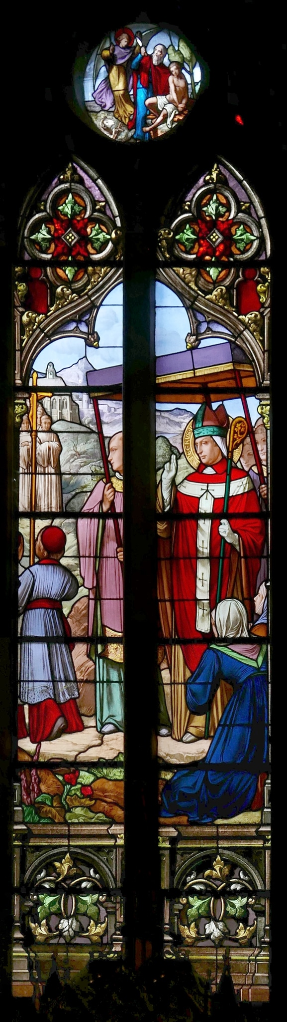 Zweilanzettiges Masswerkfenster mit einer Darstellung des zum Bischof von Tarentaise berufenen heiligen Peter II. von Tarentaise (1102–1174), der die Zisterzienserabtei Tamié verlässt, deren erster Abt er war. Der Heilige ist bereits mit den Insignien des Bischofs ausgestattet und steht unter einem tragbaren Baldachin zur Abreise nach Moûtiers bereit. Ein Chorknabe geht ein Kruzifix tragend voran, während Peter II. von Tarentaise sich von den anwesenden Frauen und den Mönchen der im Hintergrund gezeigten Abtei verabschiedet und sie segnet. Die Bildszene ist über einem architektonischen Sockel platziert und von schmalen Säulen flankiert, über denen sich ein Baldachin im Stil der Neugotik erhebt. In der kreisrunden Öffnung des Couronnement ist das Opfer Abrahams zu sehen. Abraham hat bereits das Messer gegen seinen Sohn Isaak erhoben, der nackt und gefesselt auf dem Feuerholz sitzt, als ihn der Engel des Herrn zurückhält (Gen 22, 9–13). Im Vordergrund ist der Widder zu sehen, der anstelle Isaaks geopfert wird.
