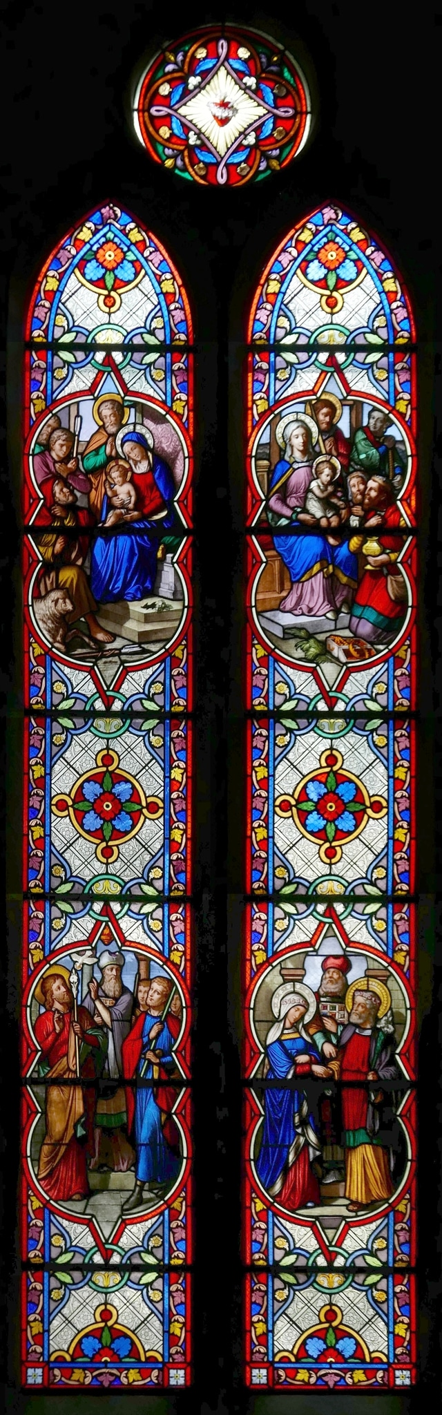 Zweilanzettiges Masswerkfenster mit vier Bildmedaillons auf einem mit farbigen geometrischen Motiven, Grisaillemalerei sowie Blatt- und Blütenornamenten im Stil der Gotik gestalteten Hintergrund. Die Medaillons zeigen von links nach rechts und von unten nach oben vier Episoden aus dem Leben Josephs: (1) Joseph wird als Bräutigam von Maria auserwählt: ein Priester und mehrere junge Männer mit Stöcken haben sich versammelt; der Legende nach erblüht der Stab Josephs und eine Taube setzt sich auf der Blüte nieder, wodurch Joseph als Bräutigam Marias identifiziert wird. (2) Maria und Joseph werden vom Hohepriester getraut: die beiden sind mit Rosenkränzen geschmückt und reichen sich die Hand; der Priester segnet ihre Verbindung. (3) Die Anbetung der Hirten (Lk 2, 8–20): das neugeborene Jesuskind sitzt auf dem Schoss seiner Mutter neben Joseph; links sind drei betende Hirten und ein Schaf zu sehen. (4) Die Anbetung der Könige (Mt 2, 9–10): das Jesuskind sitzt auf dem Schoss seiner Mutter neben Joseph; rechts sind die drei Könige Balthasar, Melchior und Caspar mit ihren Geschenken dargestellt. In der kreisrunden Öffnung des Couronnement ist in einem Vierpass mit Blattornamenten das mit Rosen gekränzte brennende Herz Marias in einem Strahlenkranz gezeigt.