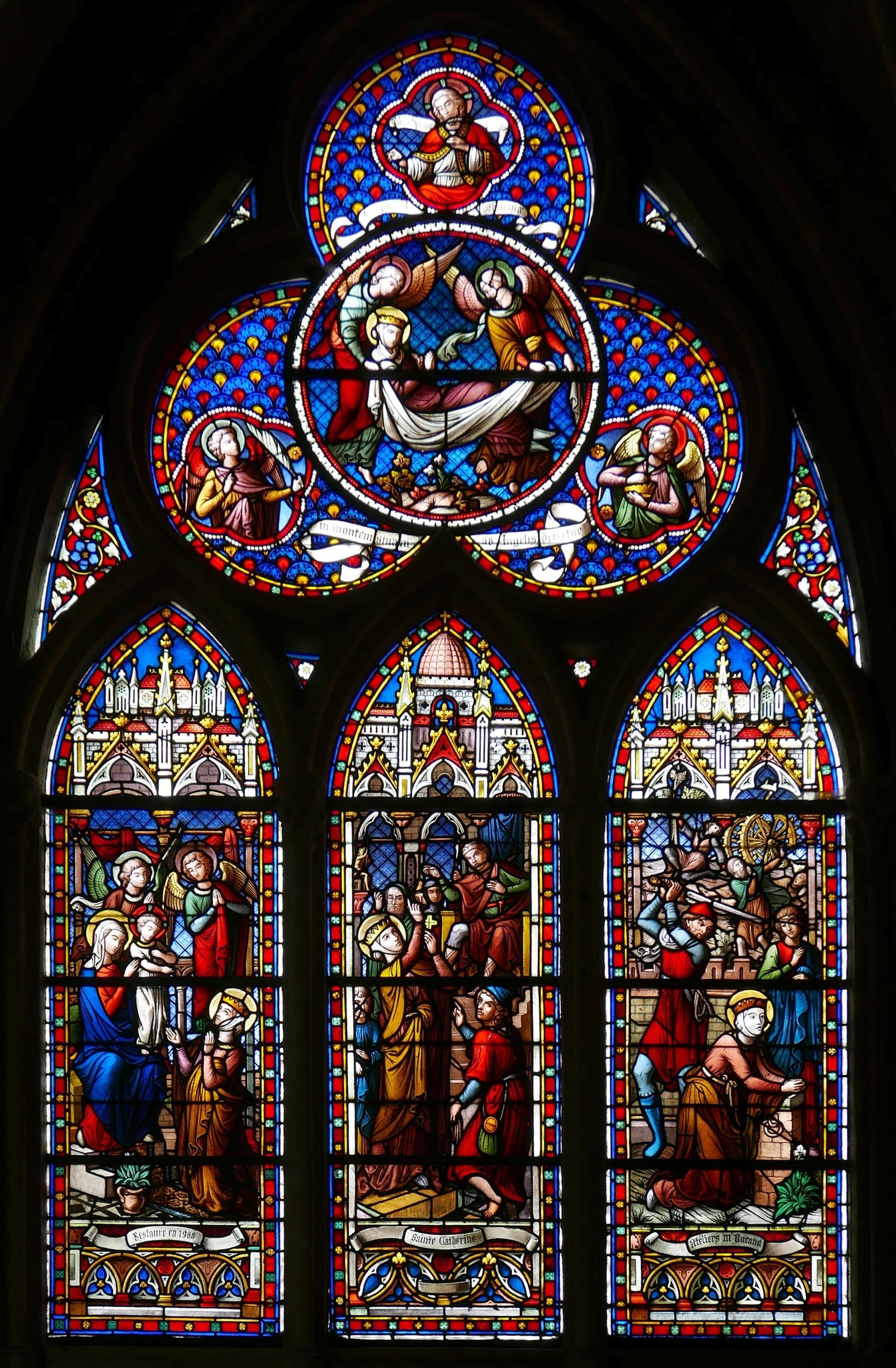 In der zweiten Hälfte des 19. Jahrhunderts setzten sich die beiden Pfarrer François Xavier Lemaire (1858–1867) und Célestin Laurent (1867–1897) für die Restaurierung der Kirche Notre-Dame von Senlis und ihre Ausstattung, unter anderem mit einem umfangreichen Glasmalereiensemble, ein (Aubert, 1910, 49). Dazu gehört das Katharina-Fenster von 1881/82 aus dem Pariser Glasmalerei-Atelier Gsell-Laurent (siehe Laurent, 1889, 3–5; sowie die Entwurfszeichnung im Pariser Musée Carnavalet, D.14756-54).