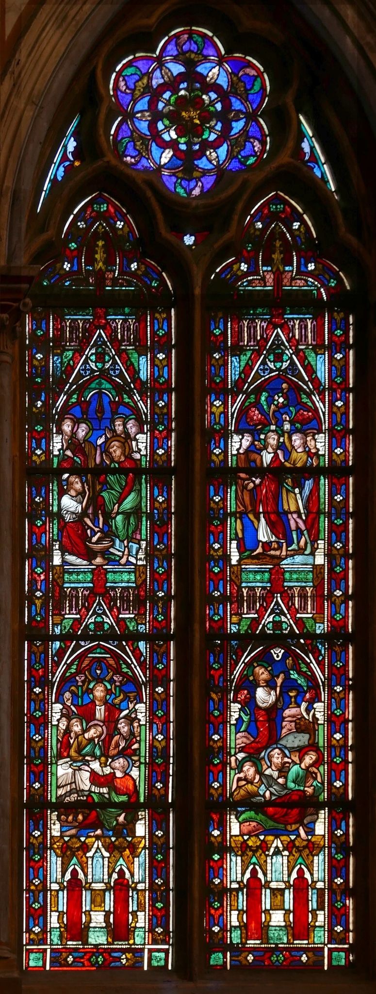 Masswerkfenster mit zwei in Nonnenköpfen endenden Lanzetten; darüber Sechspass als Couronnement. Beide Lanzetten enthalten über einem architektonischen Sockel zwei Bildszenen auf blauem Grund, die von krabbenbesetzten Baldachinen im Stil der Gotik überfasst und von links oben im Gegenuhrzeigersinn gelesen werden. Links oben ist die Fusswaschung gezeigt (Joh 13, 1–11): Jesus kniet mit einer roten Schürze bekleidet am Boden und wäscht die Füsse seines Jüngers Simon Petrus; im Hintergrund sind vier weitere Jünger zu sehen. Links unten ist das Abendmahl dargestellt (Mt 26, 20–28): Jesus Christus steht mit Brot und Kelch in den Händen hinter dem Tisch, an dem sich seine Jünger versammelt haben; diese sind in Anbetracht des bevorstehenden Verrats betrübt; Judas sitzt mit dem Geldbeutel in der linken Hand vor dem Tisch und taucht seine rechte Hand in eine auf dem Tisch stehende Schüssel. Die Bildszene unten rechts zeigt Jesus am Ölberg (Lk 22, 39–44): vor dem betenden Jesus Christus steht ein Kelch auf einem Stein, im Vordergrund schlafen drei Jünger. Oben rechts ist die Gefangennahme Jesu (Lk 22, 47–53) zu sehen: ein Soldat hat beide Hände von Jesus Christus ergriffen, während ein anderer diesem mit einer Laterne ins Gesicht leuchtet.