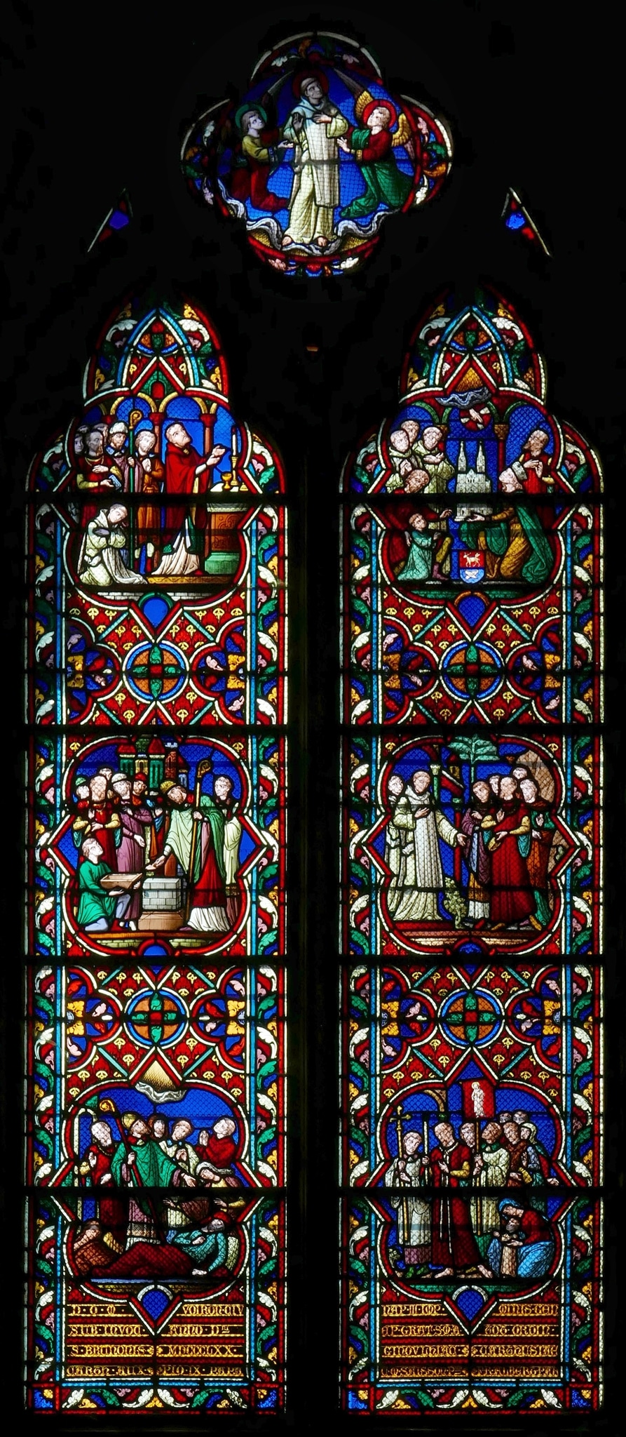 Masswerkfenster mit zwei in Nonnenköpfen endenden Lanzetten; darüber Vierpass als Couronnement. Die Lanzetten enthalten je drei Medaillons mit Bildszenen, die von links nach rechts und von unten nach oben gelesen werden. Thema des Fensters sind die Geschichte Voirons und die Baugeschichte der Kirche Saint-Bruno. Zuunterst ist links die Pestepidemie des 17. Jahrhunderts in Voiron gezeigt: zwei Kranke liegen ausgestreckt am Boden, ein Bischof und weitere Menschen besuchen die Leidenden, um sie zu pflegen und Trost zu spenden. Der Mann links des Bischofs trägt die Gesichtszüge von Henry-Frédéric Faige-Blanc (1811–1901), Bürgermeister von Voiron ab 1851 und wichtiger Förderer des Kirchenbaus, hier die Stadtverwaltung von Voiron repräsentierend. Rechts ist eine Prozession zu Ehren des heiligen Bruno dargestellt: Der Bürgermeister Faige-Blanc geht mit einer Kerze neben einem Messdiener mit Kreuz voran, hinter ihm folgt die Menge und ein Mann mit einem Banner, das den heiligen Bruno zeigt; eine Frau lässt ihr Kind segnen. Die mittleren Medaillons zeigen links die Grundsteinlegung der Kirche Saint-Bruno in Voiron: Jacques-Marie-Achille Ginoulhiac (1852–1870), Bischof von Grenoble, entnimmt mit einer Kelle Zement aus einer ihm hingereichten Kiste; der Bürgermeister Faige-Blanc und weiteres Publikum wohnen der Zeremonie bei. Rechts wird Delegation aus Voiron in der Grande Chartreuse empfangen: Zwei Brüder gehen dem Bürgermeister und seinen Begleitern entgegen, die um Unterstützung für den Kirchenbau bitten. Darüber findet sich links eine Darstellung der Kirchenweihe: ein Priester feiert das Messopfer am Altar; hinter ihm stehen Bischof, Bürgermeister und weitere Personen. Rechts ist gezeigt, wie eine Frau – die Allegorie der Stadt Voiron – die Kirche Saint-Bruno Gott schenkt, dessen segnende Hand am oberen Rand des Medaillons erscheint. Rechts ist wieder der Bürgermeister Faige-Blanc zu sehen, links drei Kartäuser sowie ein Mann mit Kind, die Bevölkerung von Voiron vertretend. Am Fuss des Medaillons Stadtwappen von Voiron. Im Couronnement ist der Triumph des heiligen Bruno abgebildet; in hellem Mönchsgewand schwebt Bruno begleitet von zwei Engeln in den Himmel.