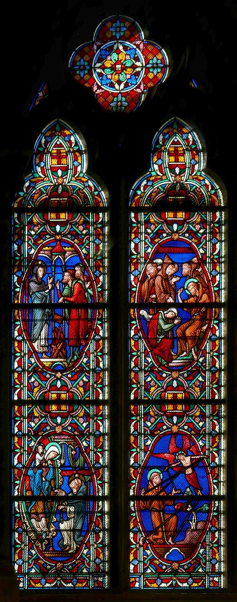 Masswerkfenster mit zwei in Nonnenköpfen endenden Lanzetten; darüber Vierpass als Couronnement. Beide Lanzetten enthalten zwei Medaillons mit Bildszenen, die von unten nach oben gelesen werden. Links unten ist der Ordensgründer Dominikus (1170–1221) gezeigt, dem die heilige Jungfrau Maria, die mit ihrem Kind in einer Mandorla schwebt, einen Rosenkranz überreicht. Darüber ist dargestellt, wie der heilige Dominikus zwei Albigenser bekehrt; er fordert sie auf, sein Buch und ihre Bücher ins Feuer zu werfen, und der Lehre desjenigen Buches zu folgen, welches vom Feuer nicht verschlungen würde. Das Medaillon rechts unten zeigt Franz von Assisi (1182–1226), der die Stigmata erhält; sie übertragen sich von einem vor Franz schwebenden gekreuzigten und geflügelten Jesus auf den Heiligen. Darüber ist der Tod des Franz von Assisi zu sehen: der kranke Heilige stirbt im Kreis seiner trauernden Anhänger; vor ihm kniet eine Frau, vermutlich Klara von Assisi.