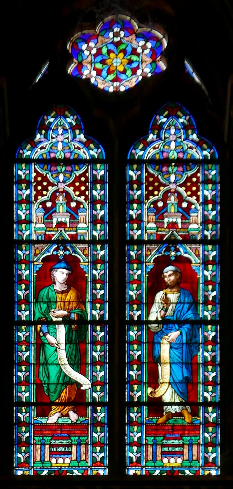 Masswerkfenster mit zwei in Nonnenköpfen endenden Lanzetten; darüber Sechspass als Couronnement. Das Obergadenfenster zeigt zwei der «kleinen» Propheten als Ganzfiguren auf rotem Grund: Habakuk in der linken Lanzette, Maleachi in der rechten Lanzette. Beide Propheten halten Schriftbänder mit einem Ausschnitt ihrer Prophezeiungen in den Händen. Die Figuren stehen auf einem architektonischen Sockel mit jeweiligem Namenszug und sind von schmalen Säulen flankiert, über denen sich Baldachine im Stil der Gotik und je ein Vierpass erheben. Die Lanzetten haben farbige ornamentale Rahmen. Im Couronnement konzentrisch angeordnete Blüten- und Blattornamente; zudem mehrere Masswerkspickel mit farbigen Füllungen.